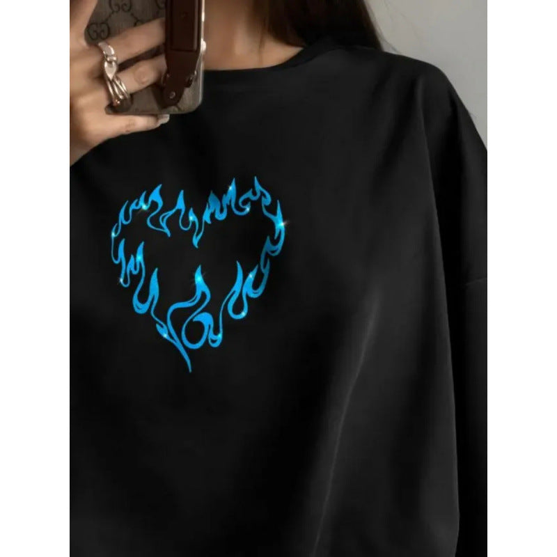 Vores dames afslappede grafik T-shirt med kreativt flammehjerte-design er den perfekte følgesvend for modebevidste kvinder. Med sin oversized pasform og det unikke print skiller denne T-shirt sig ud fra andre.
