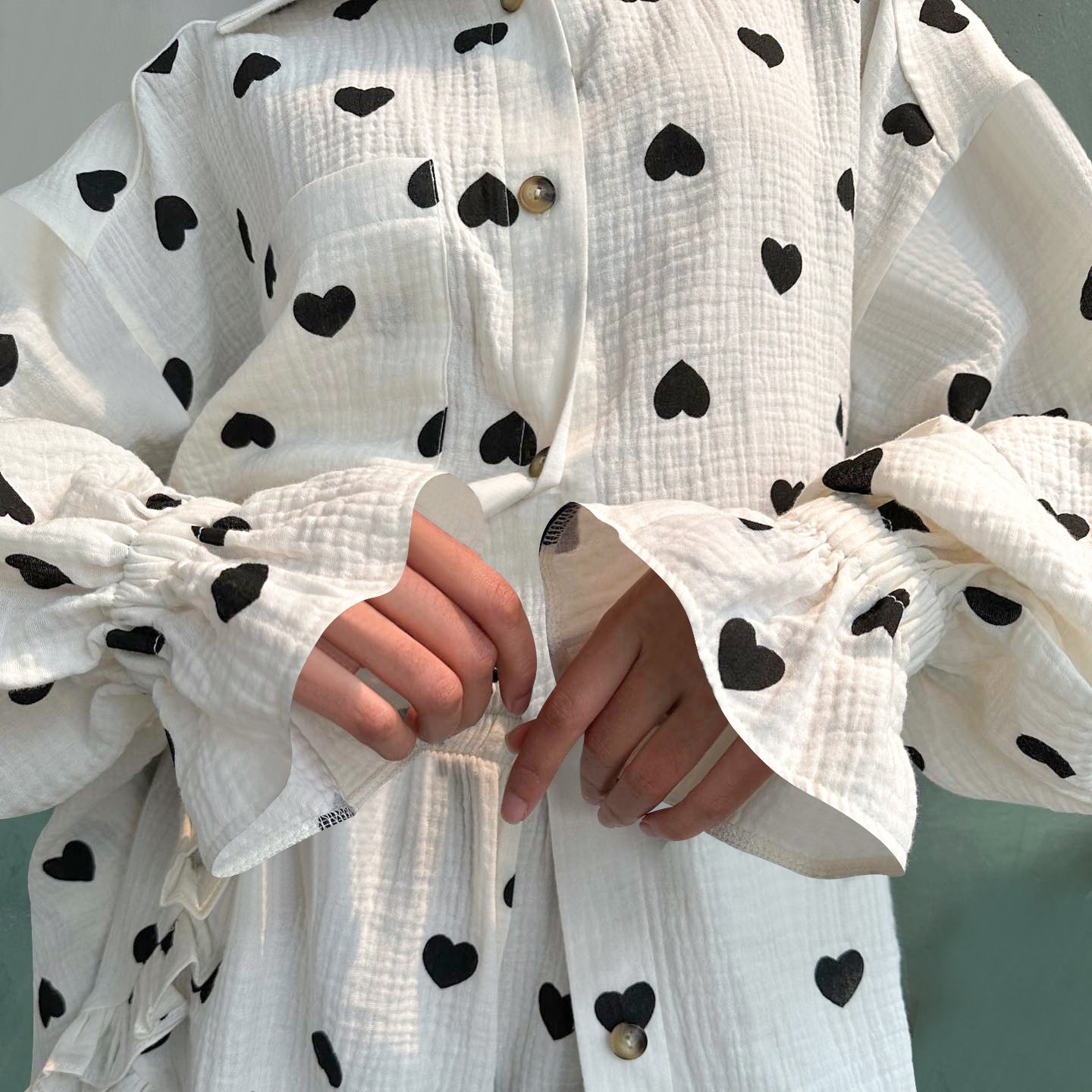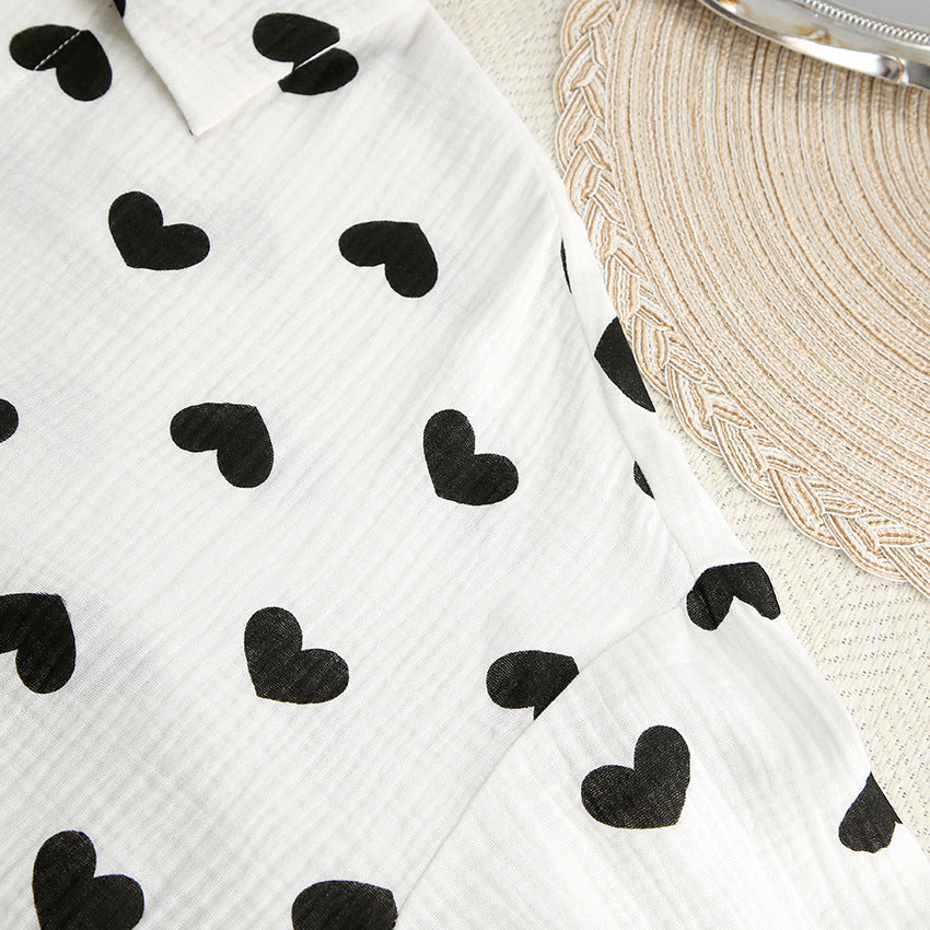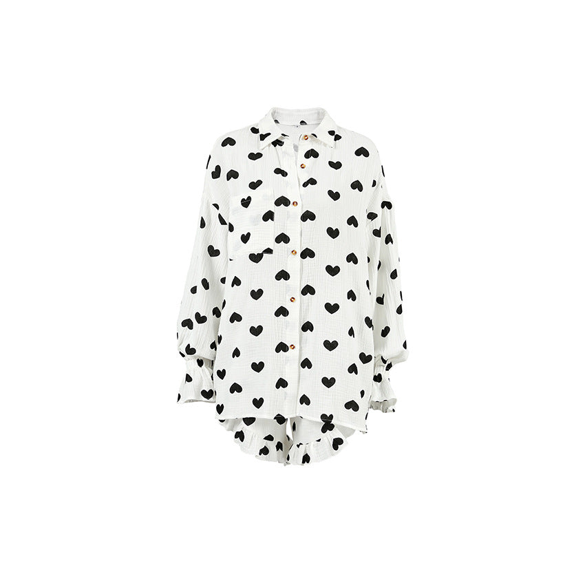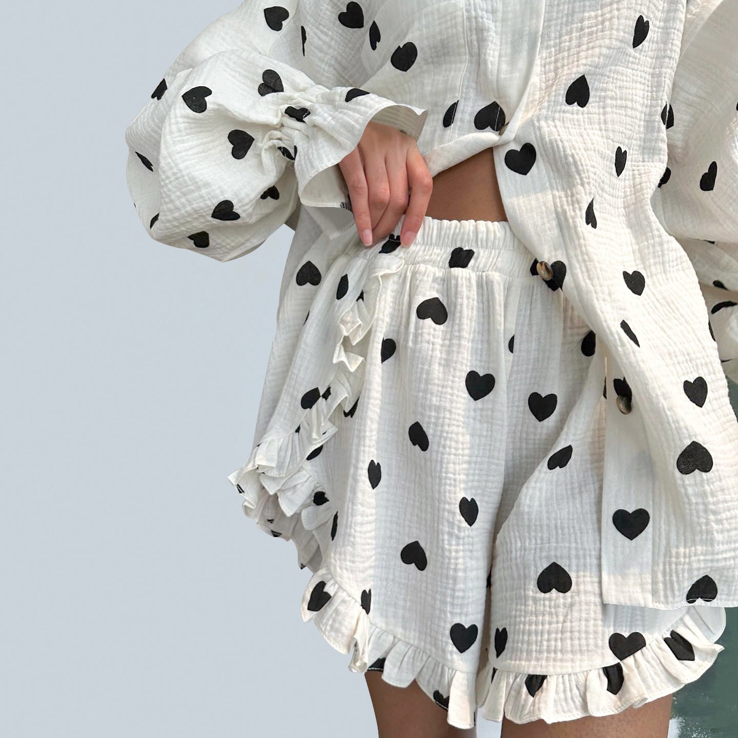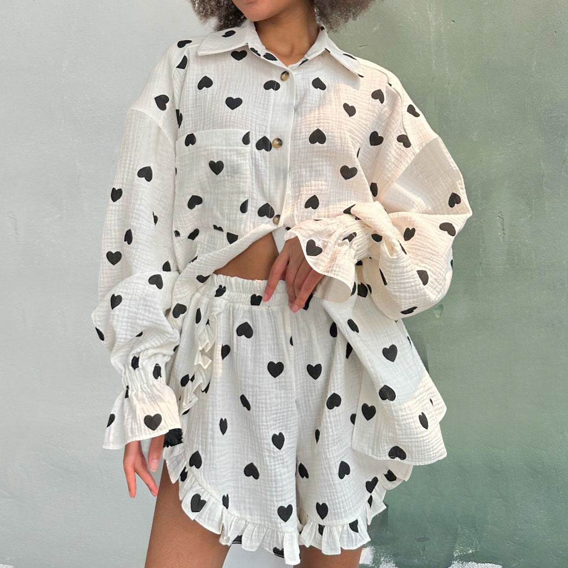 Oplev vores dames afslappede hjerteprint pyjamasæt med flæsedetaljer, ideelt til afslappede nætter og restituerende dage derhjemme. Dette stilfulde sæt kombinerer komfort med et legende design og den perfekte pasform til moderne kvinder.