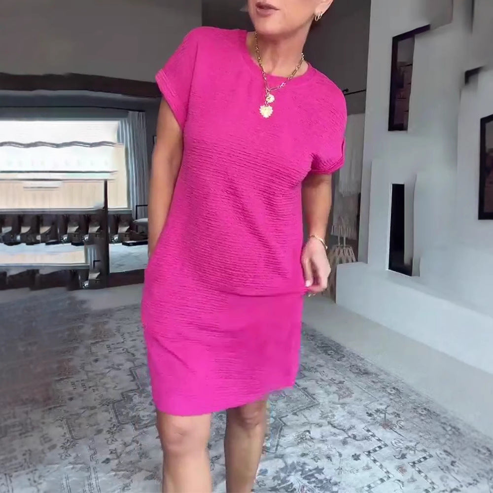 Opdag vores afslappede kortærmede kjole, der med sit strukturerede design er både stilfuld og komfortabel. Denne kjole er perfekt til sommer og kan kombineres på mange måder.