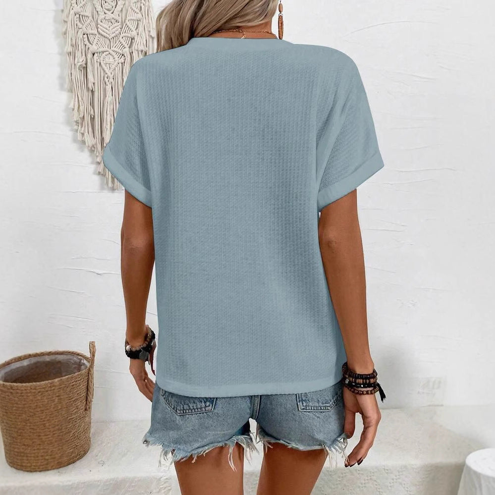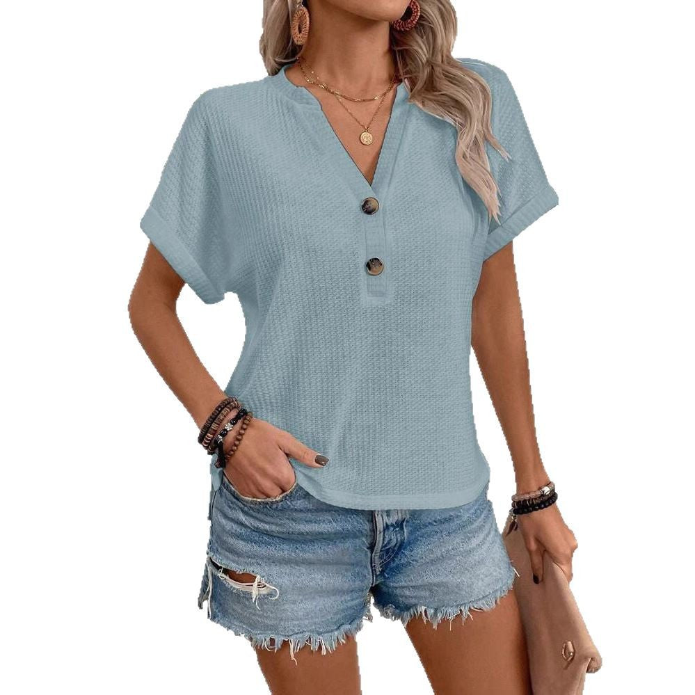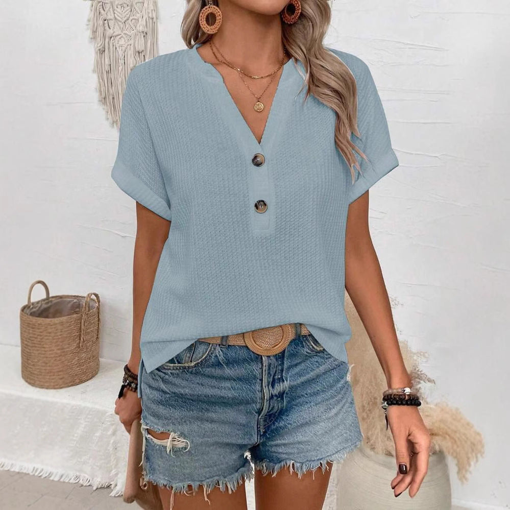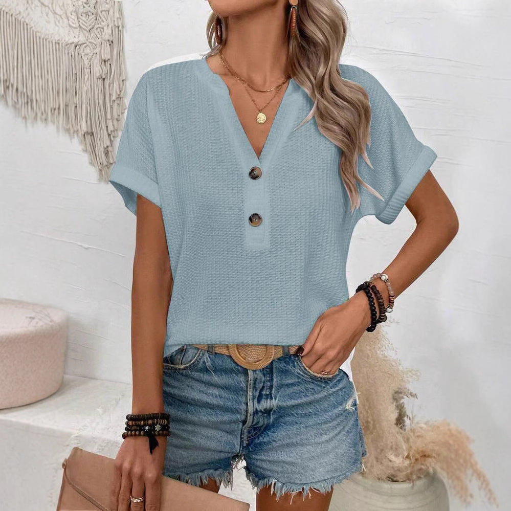 Opdag vores lässige kortærmede skjorte, der er ideel til den solrige dag. Med en moderne V-halsudskæring og en løs pasform tilbyder denne skjorte både stil og komfort. De dekorative knapper foran giver en særlig accent og tilføjer en charmerende note til skjorten.