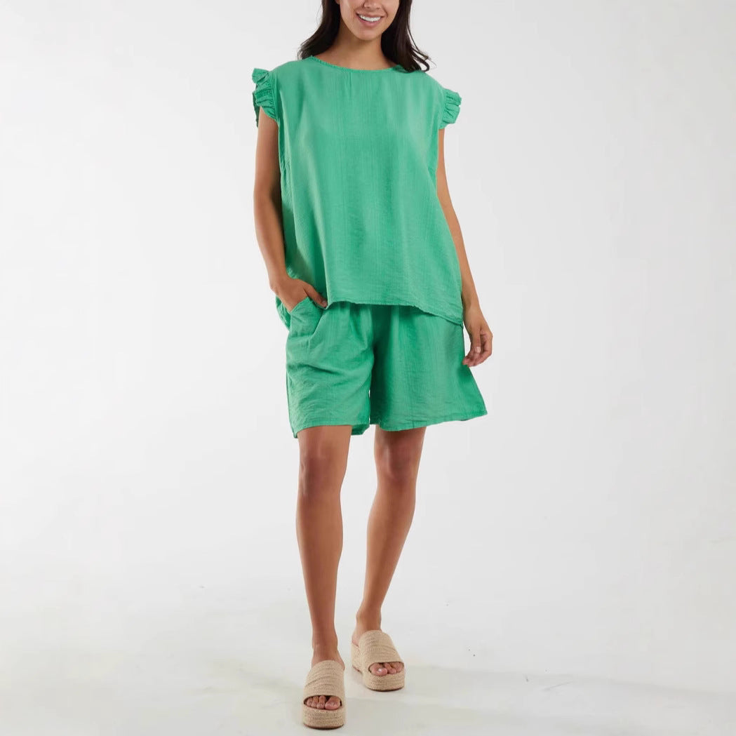 Shortsen kommer med praktiske lommer, der kombinerer funktionalitet med stil. De er ideelle til daglig brug eller en udflugt udendørs. Dette sæt er ikke kun stilfuldt, men også alsidigt og kan nemt styles til forskellige anledninger.