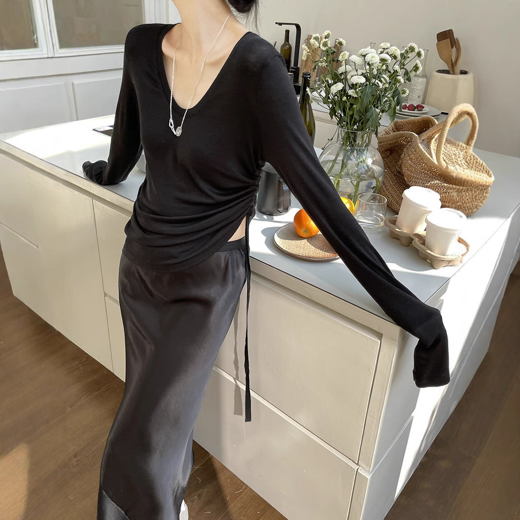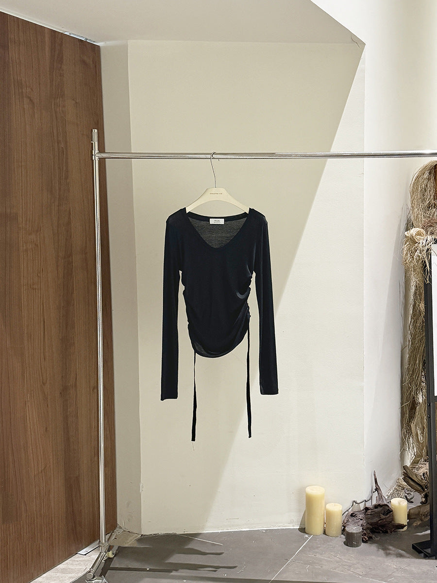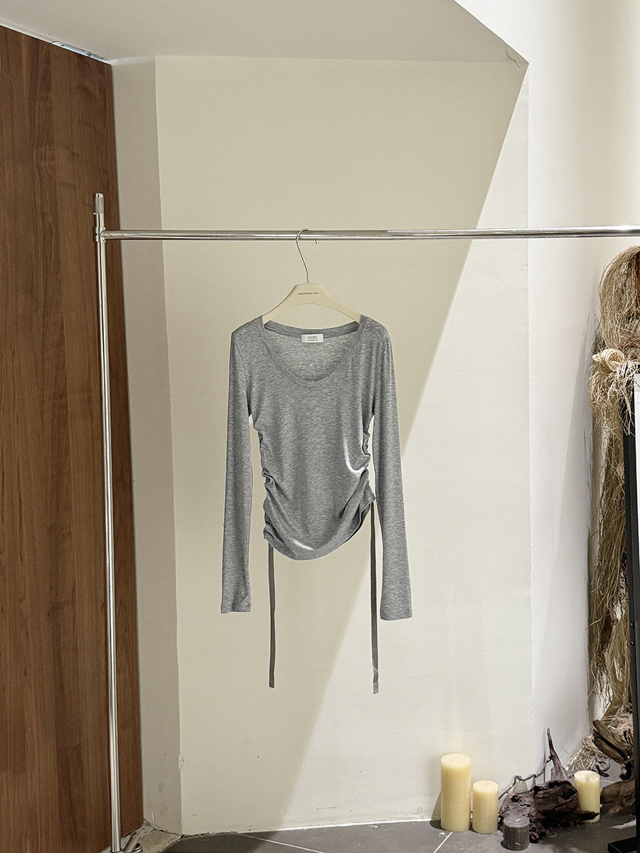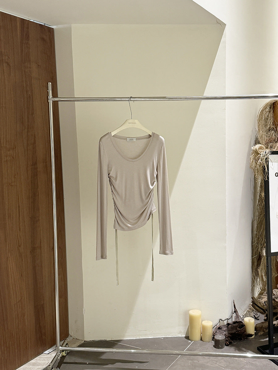 Opdag vores afslappede langærmede top, der kombinerer komfort og stil. Fremstillet af et kvalitetsmateriale, tilbyder det en behagelig pasform og et moderne design. De særlige rynkeelementer i siderne og de tilhørende bindebånd giver toppen et personligt præg.