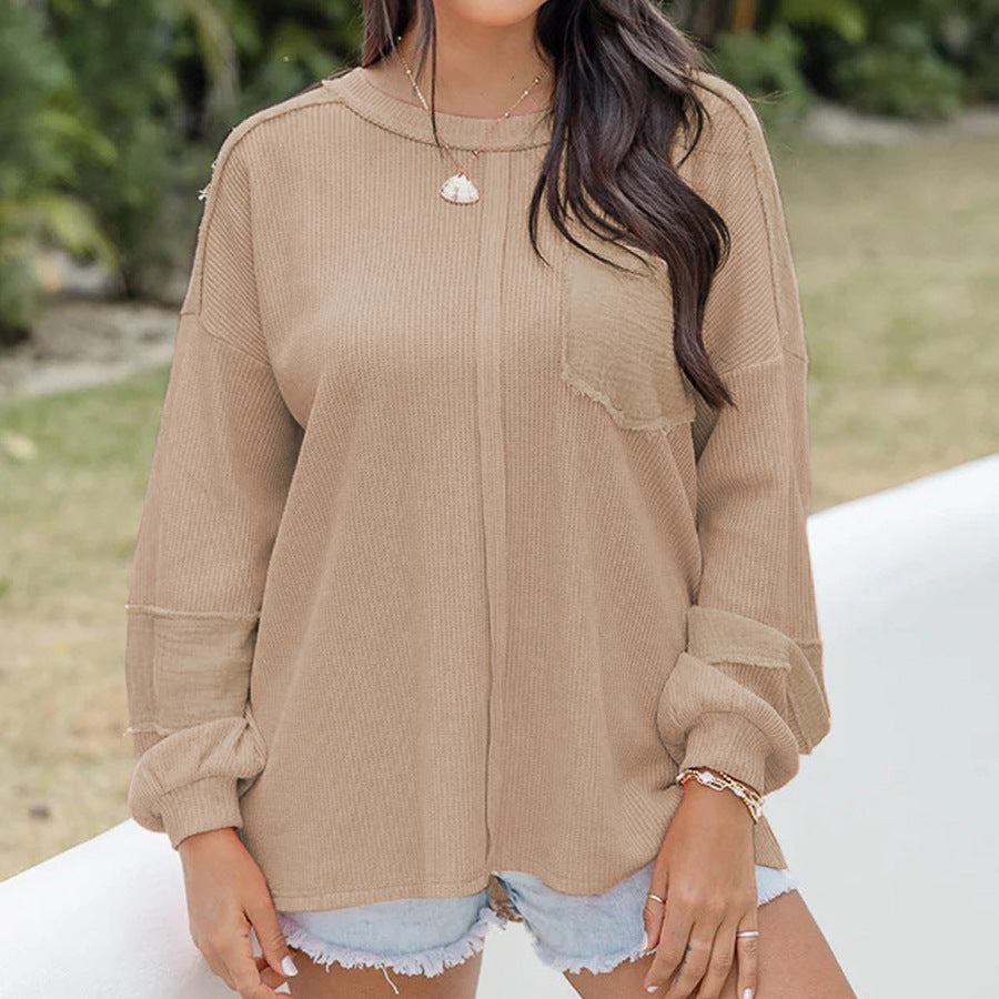 Opdag det perfekte fritidsoberste med vores dames afslappede longsleeve overdel, der ikke kun er stilfuld, men også særligt behagelig. Fremstillet af højkvalitets, åndbart materiale tilbyder det en løs pasform, der garanterer dig bevægelsesfrihed.