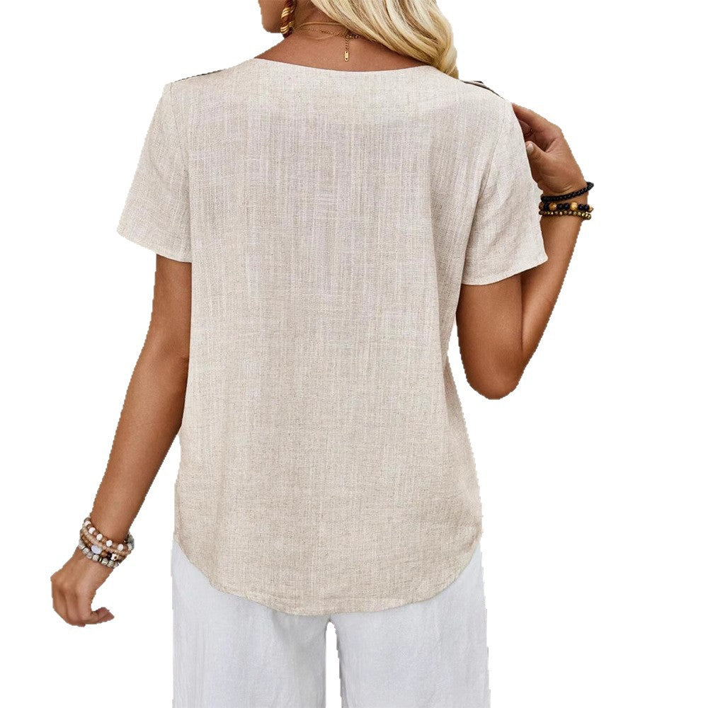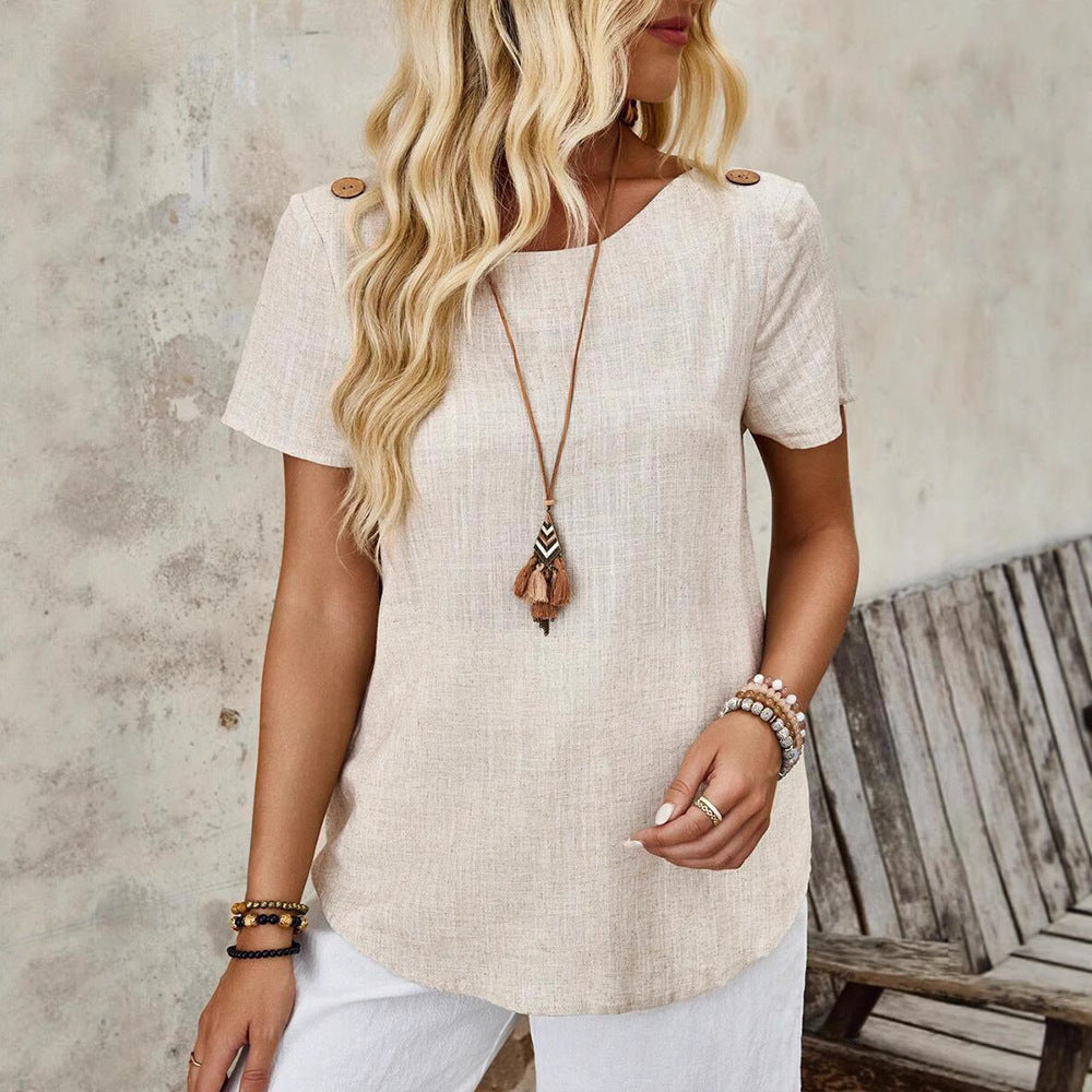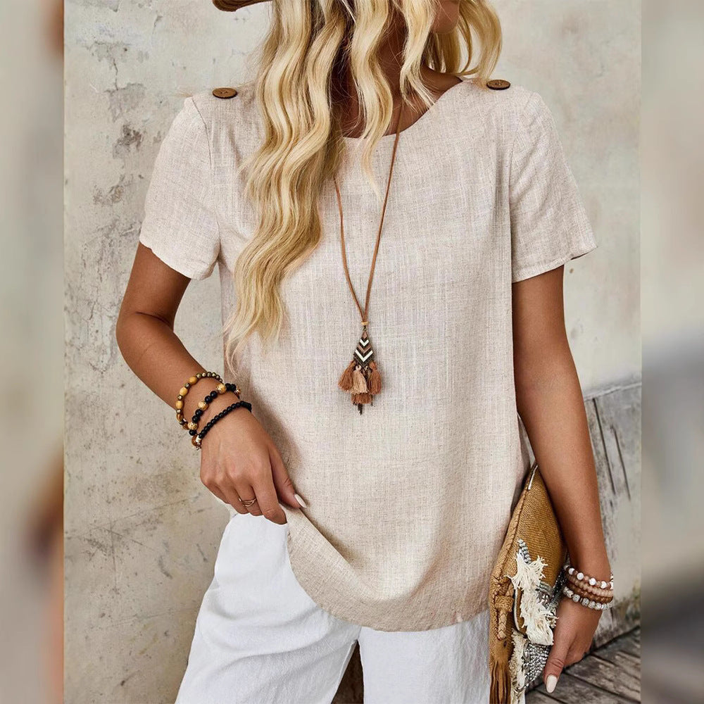 Dette stilfulde dame-top kombinerer moderne elegance med høj komfort. Fremstillet af let linned, sikrer det en behagelig følelse på huden på varme dage. De særlige knapdetaljer på skuldrene giver designet et unikt præg og adskiller sig fra almindelige toppe.