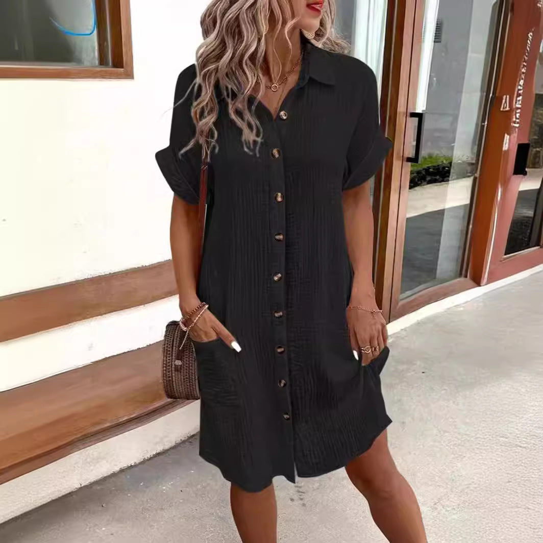 Vores afslappede linned skjortekjole er den perfekte følgesvend til sommeren og tilbyder både stil og komfort. Med sin fashionable knaplukning og praktiske sidelommer er denne kjole ideel til afslappede dage og særlige lejligheder.