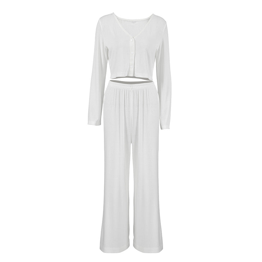 Udforsk det nyeste damesæt til afslapning, der forener stil og komfort! Dette fashionable ensemble består af en trendy crop-top med moderne knapdetaljer og afslappede, vide bukser, der er perfekte til afslappede dage derhjemme eller stilfulde udflugter.