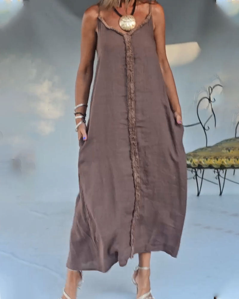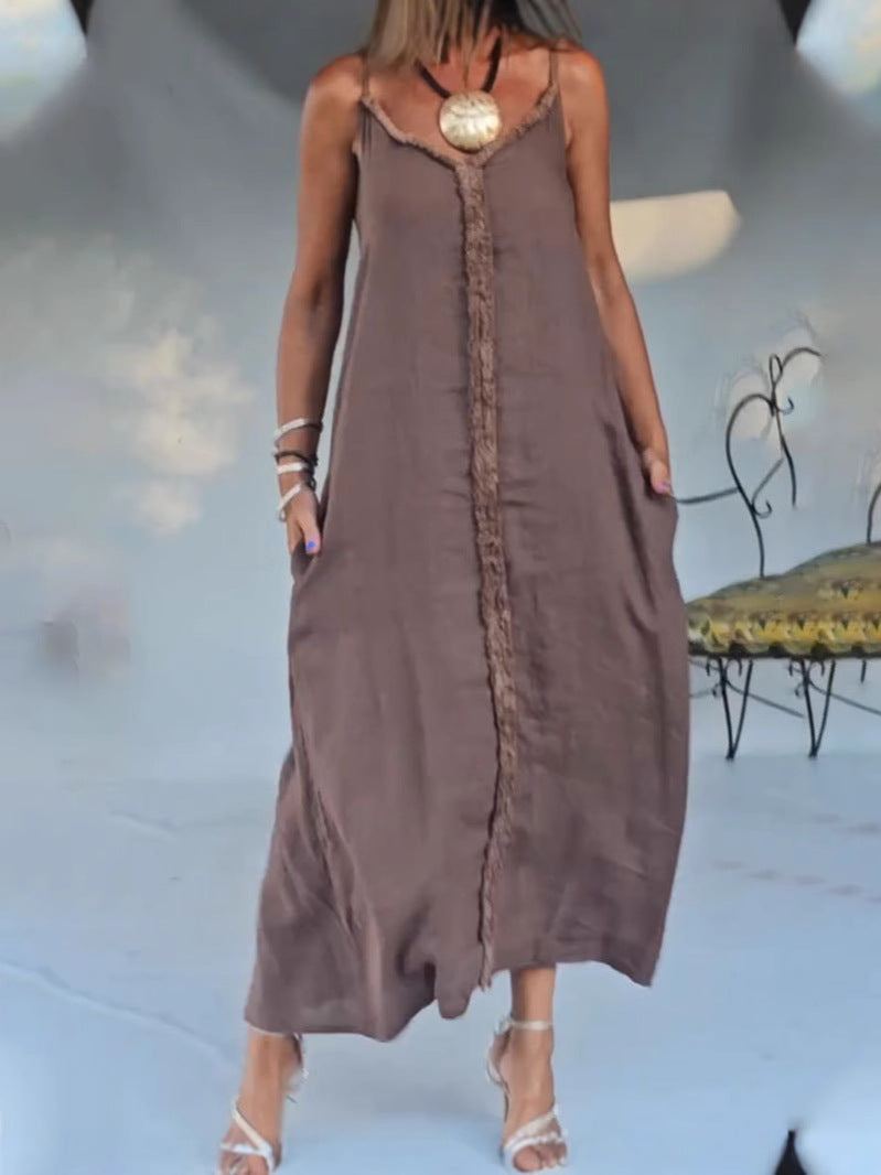 Dette damemaxikjole fra Stilla kombinerer stil og komfort på perfekt vis. Med fine frynser langs fronten og justerbare stropper, er denne kjole både stilfuld og tilpasselig til enhver lejlighed.