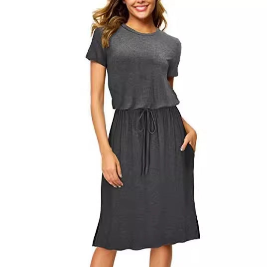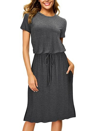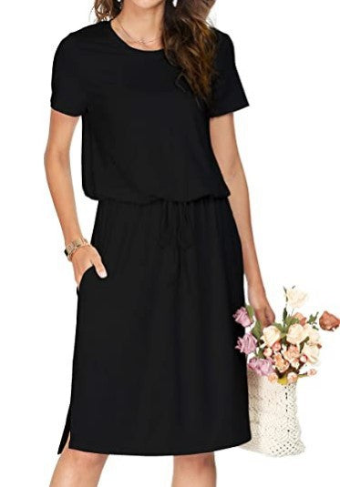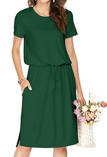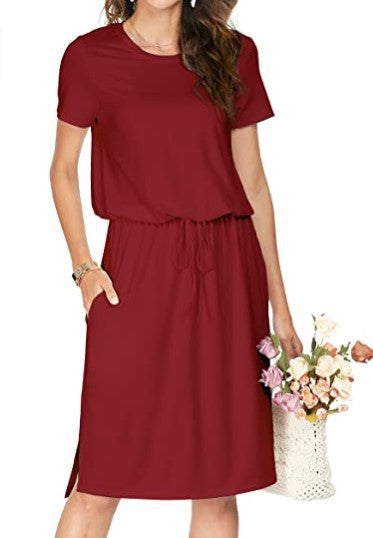 Opdag vores dame afslappede midi-kjole, der tilbyder stil og komfort i ét. Denne alsidige kjole er ideel til hverdagen og særlige lejligheder ligeledes. Med et elegant snit og en elastisk taljebånd tilpasser den sig perfekt til kroppens form og giver et flatterende look.