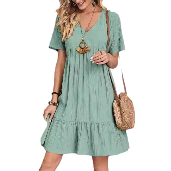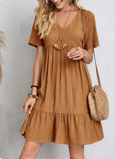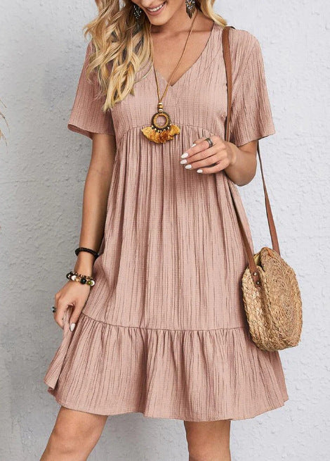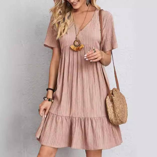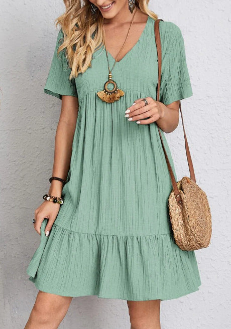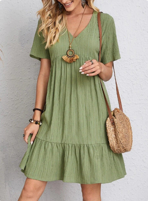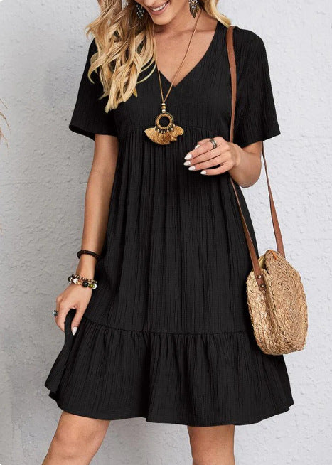 Opdag vores dameslækkert minikjole med V-hals og flæsekant fra Stilla, som er det perfekte valg til din sommergarderobe. Denne kjole kendetegnes ved sin luftige pasform, der kombinerer både komfort og stil. V-halsen fremhæver diskret деколтет, mens de korte ærmer giver behagelig bærekomfort.