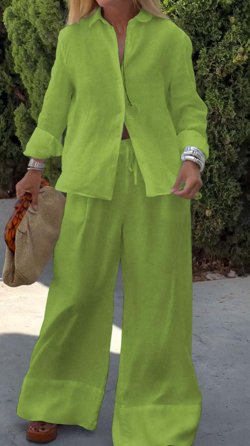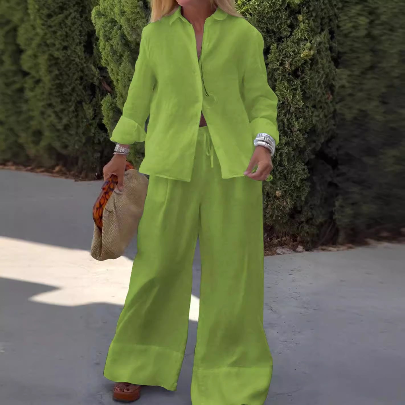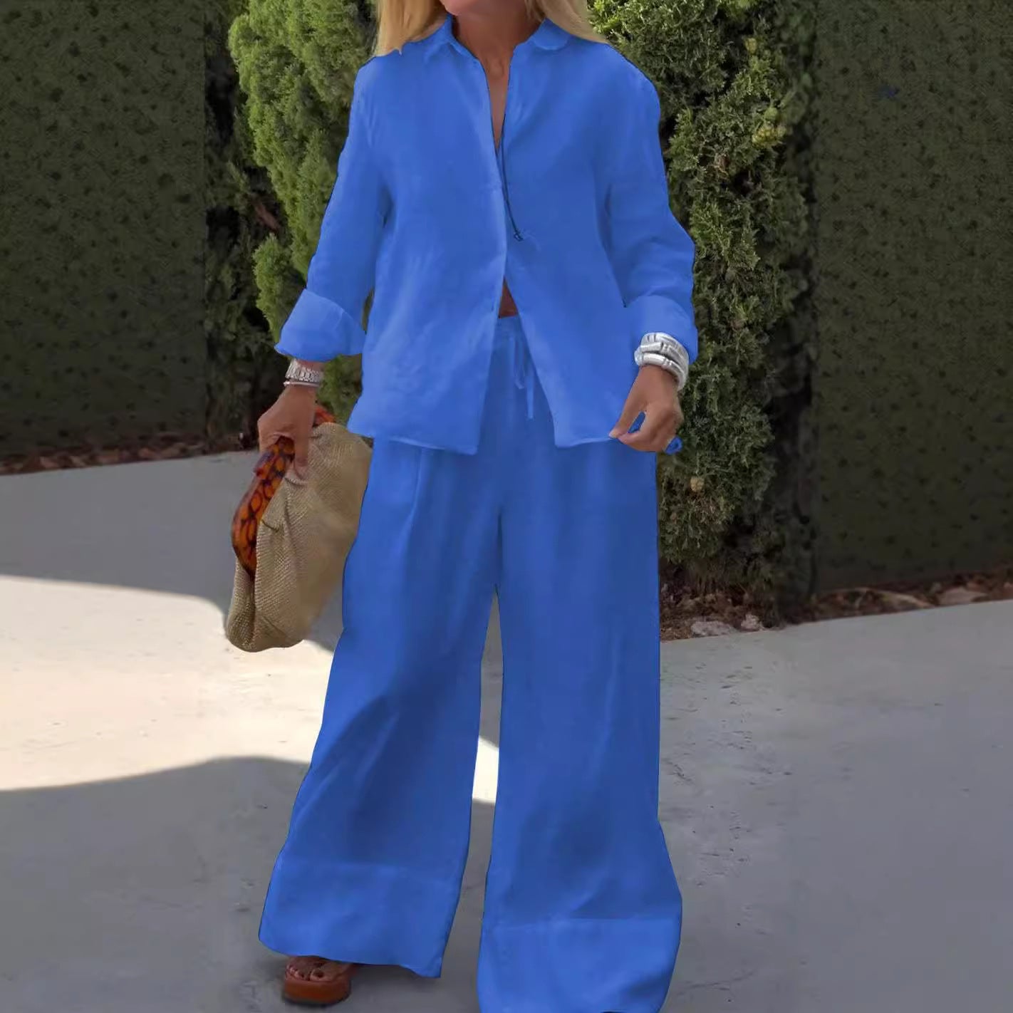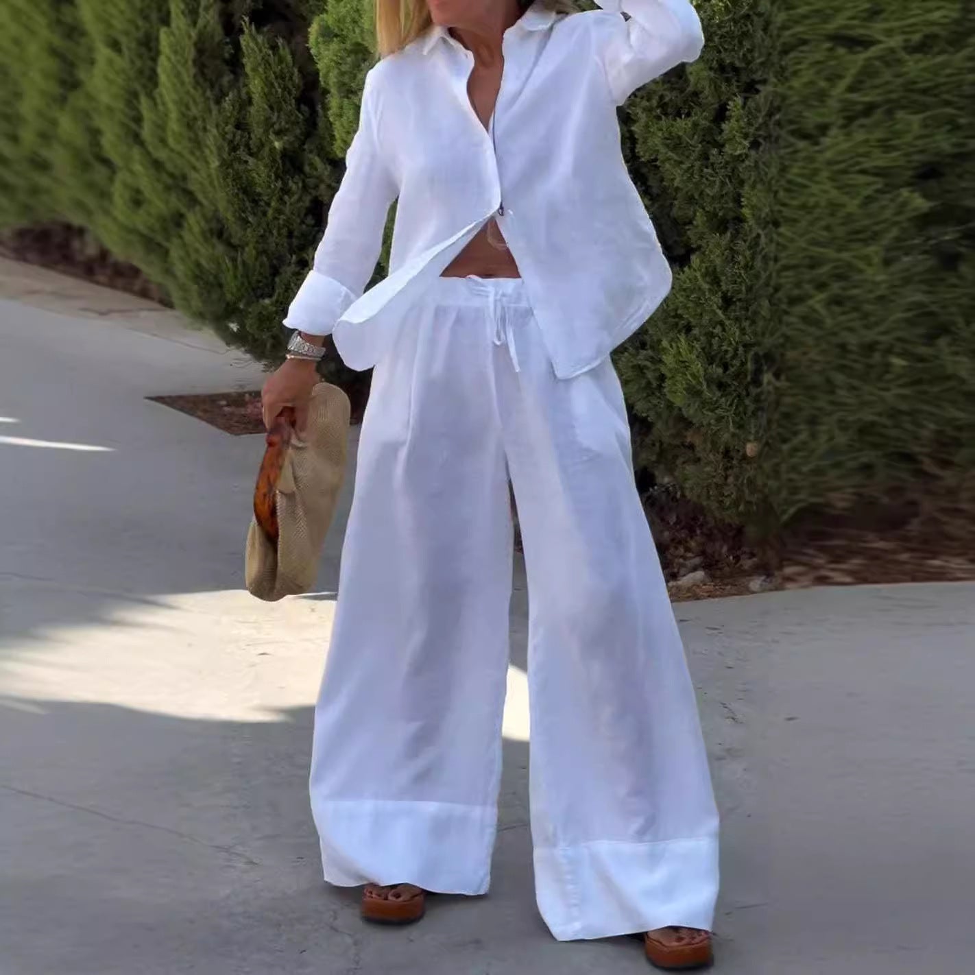 Opdag vores afslappede og luftige loungewear-sæt til damer, perfekt til afslappede dage og sommerudflugter. Dette sæt består af en let top med skjortekrave og en behagelig, løs buksemodel. Fremstillet af kvalitetsmateriale, der er åndbart, sikrer det maksimal komfort.