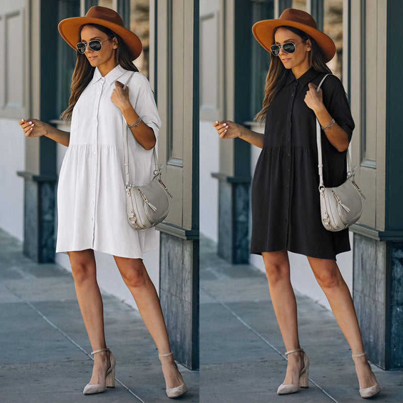 Opdag vores afslappede skjortekjole til damer, den perfekte kjole til den moderne sommer. Denne alsidige kjole kendetegnes ved sin løse pasform og den trendy snit med indsyede ærmer, ideel til varme dage og afslappede eventyr.