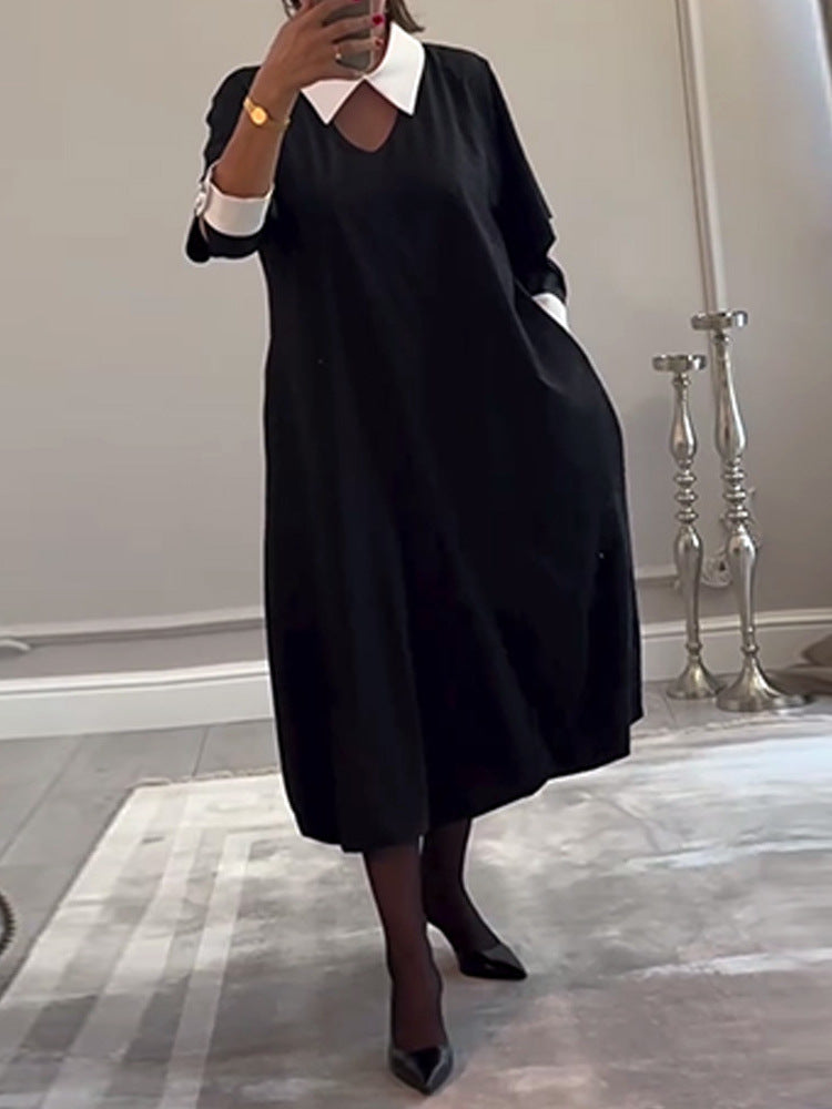 Opdag damernes afslappede skjortekjole, der imponerer med en moderigtig V-udskæring og elegante kontrastærmer. Denne kjole forener komfort og stil, ideel til både hverdag og særlige lejligheder.