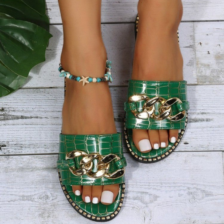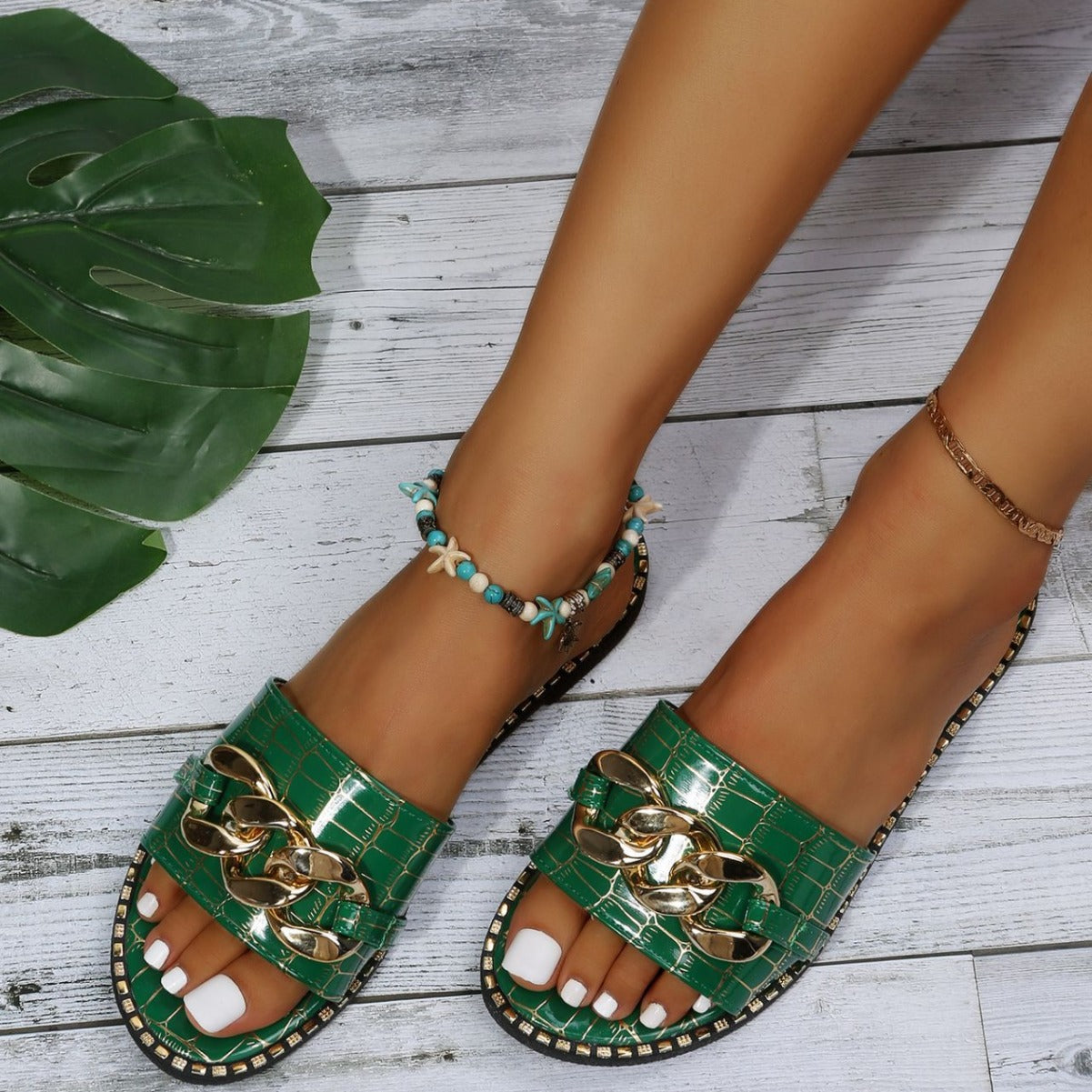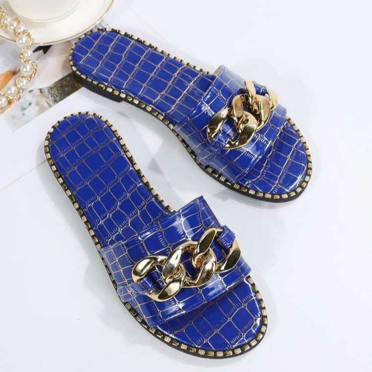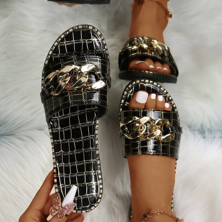 Opdag de nyeste trends med vores elegante åbne pantoletten med luksuriøs kædeaccent. Disse sko er ikke kun et ægte blikfang, men også yderst komfortable og perfekte til hverdagen eller særlige lejligheder.