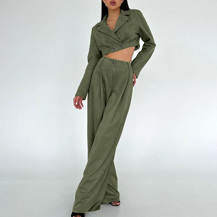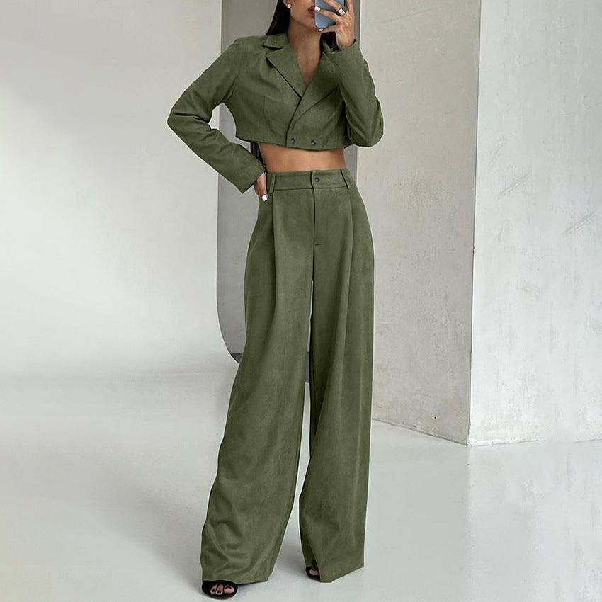 Dette stilfulde sæt forener elegance og afslappet raffinement i ét. Den croppede blazer med dobbeltknaplukning fremhæver din silhuet og giver samtidig et moderne look, mens de vide bukser tilbyder en behagelig pasform og er perfekte til enhver lejlighed.