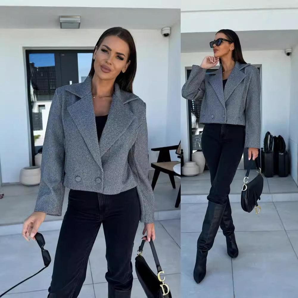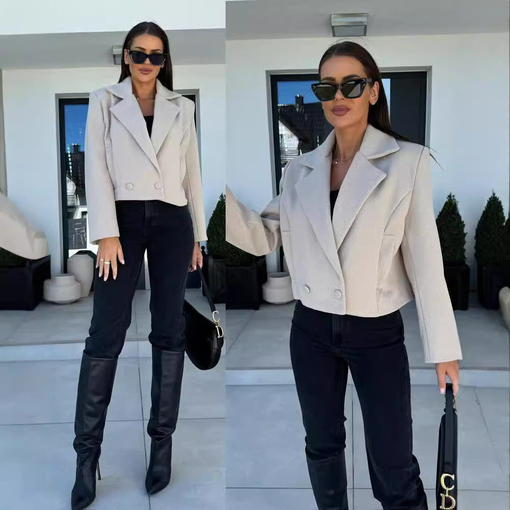 Opdag den moderne dames cropped dobbeltknaps Blazerjakke fra Stilla, der forener stilfuldt design med funktionalitet. Denne moderne jakke imponerer med sin dobbeltknapslukning og de smagfulde, brede reverskraver, der giver ethvert outfit et strejf af elegance.