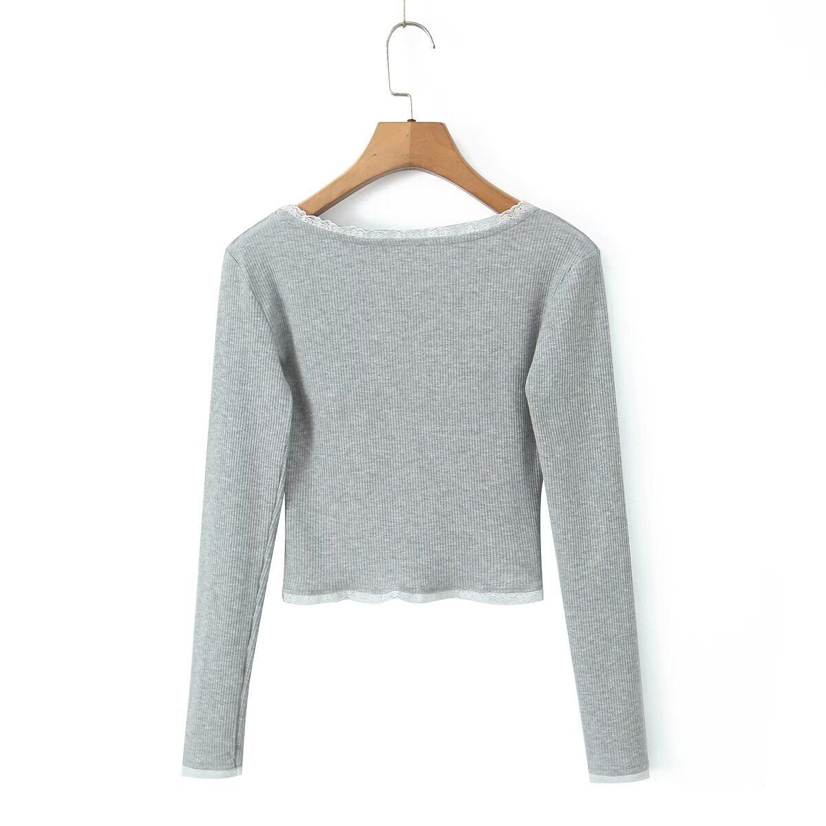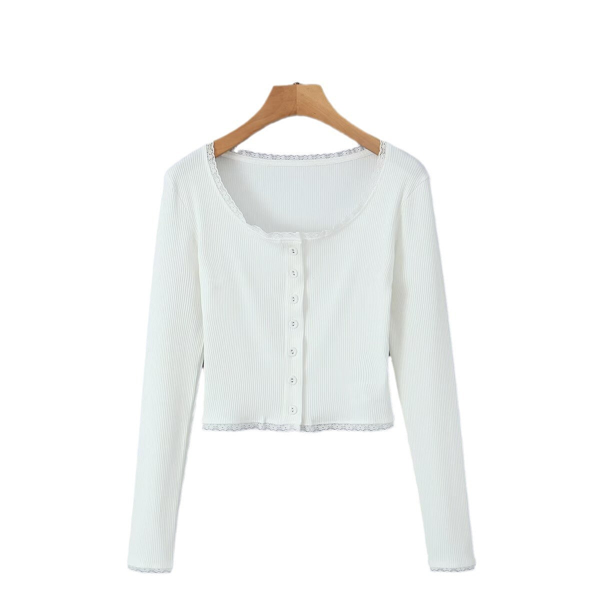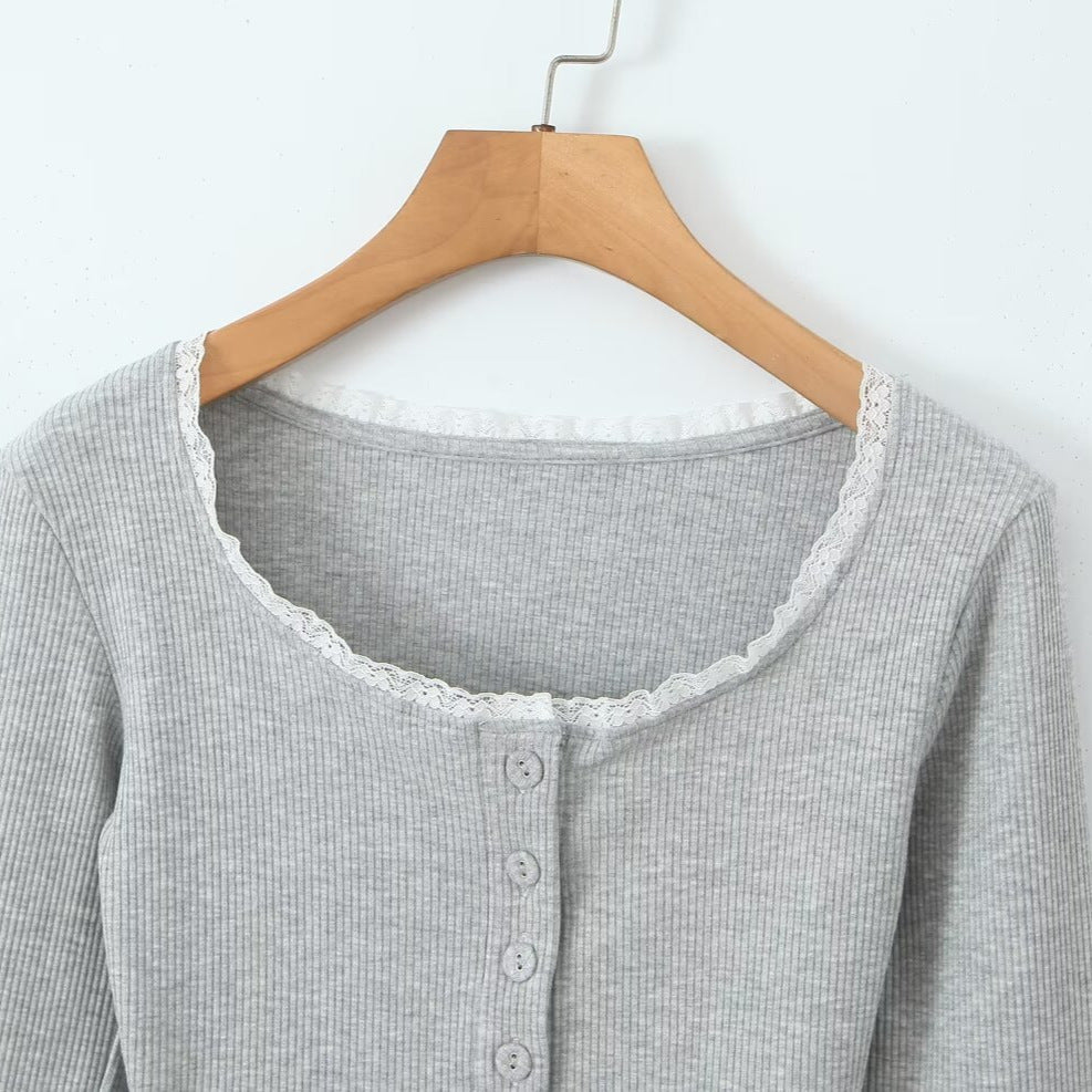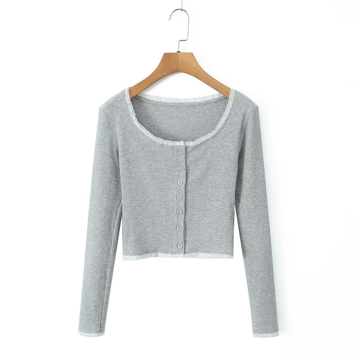 Opdag vores stilfulde dametrøje med cropped lange ærmer, der imponerer med sine romantiske blonder og den charmerende knaplukning. Ideel til afslappede hverdagslooks og særlige lejligheder.