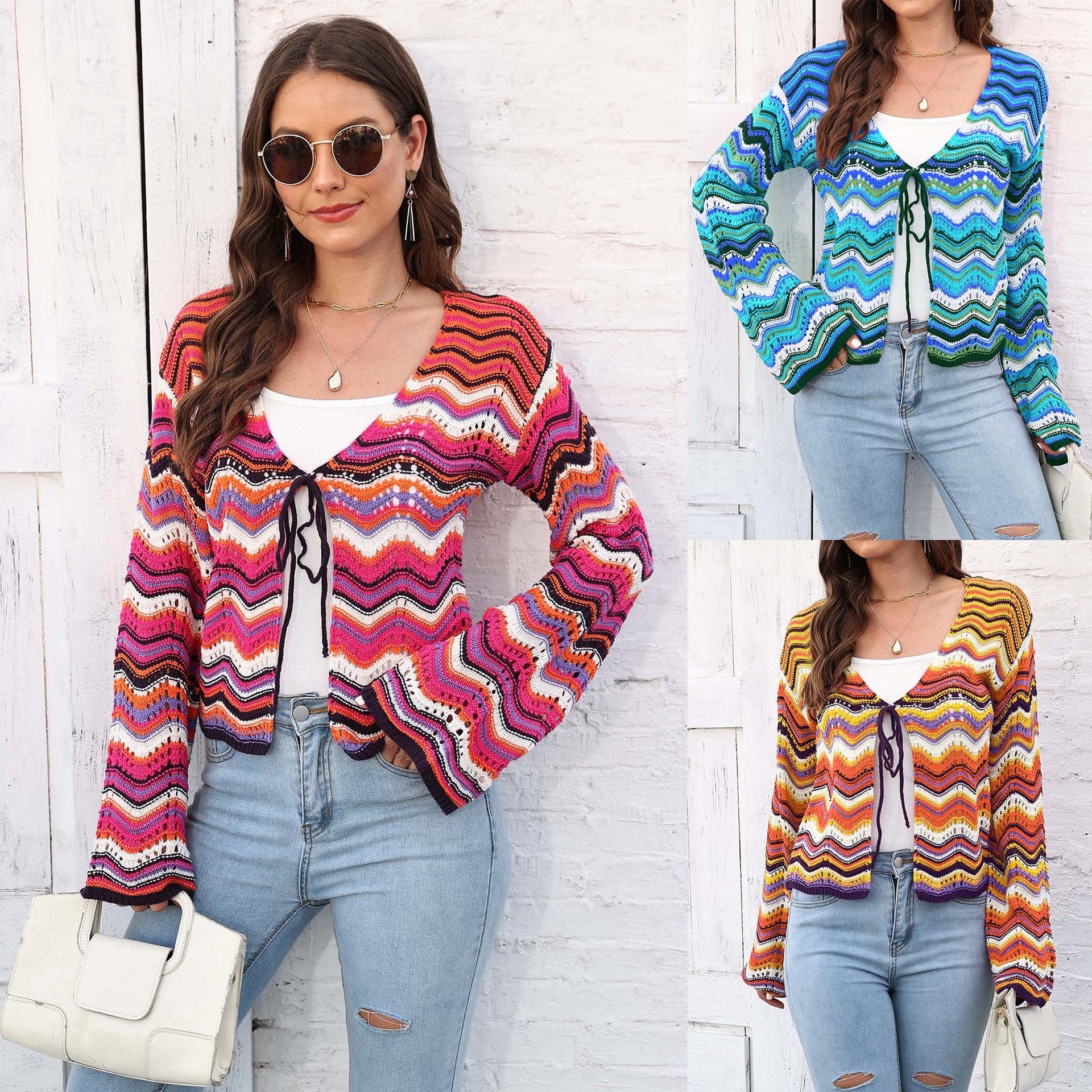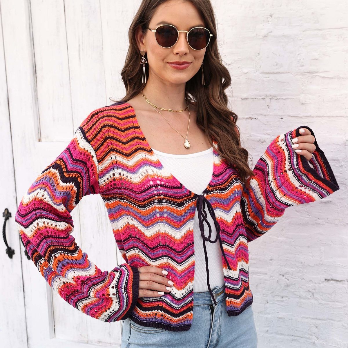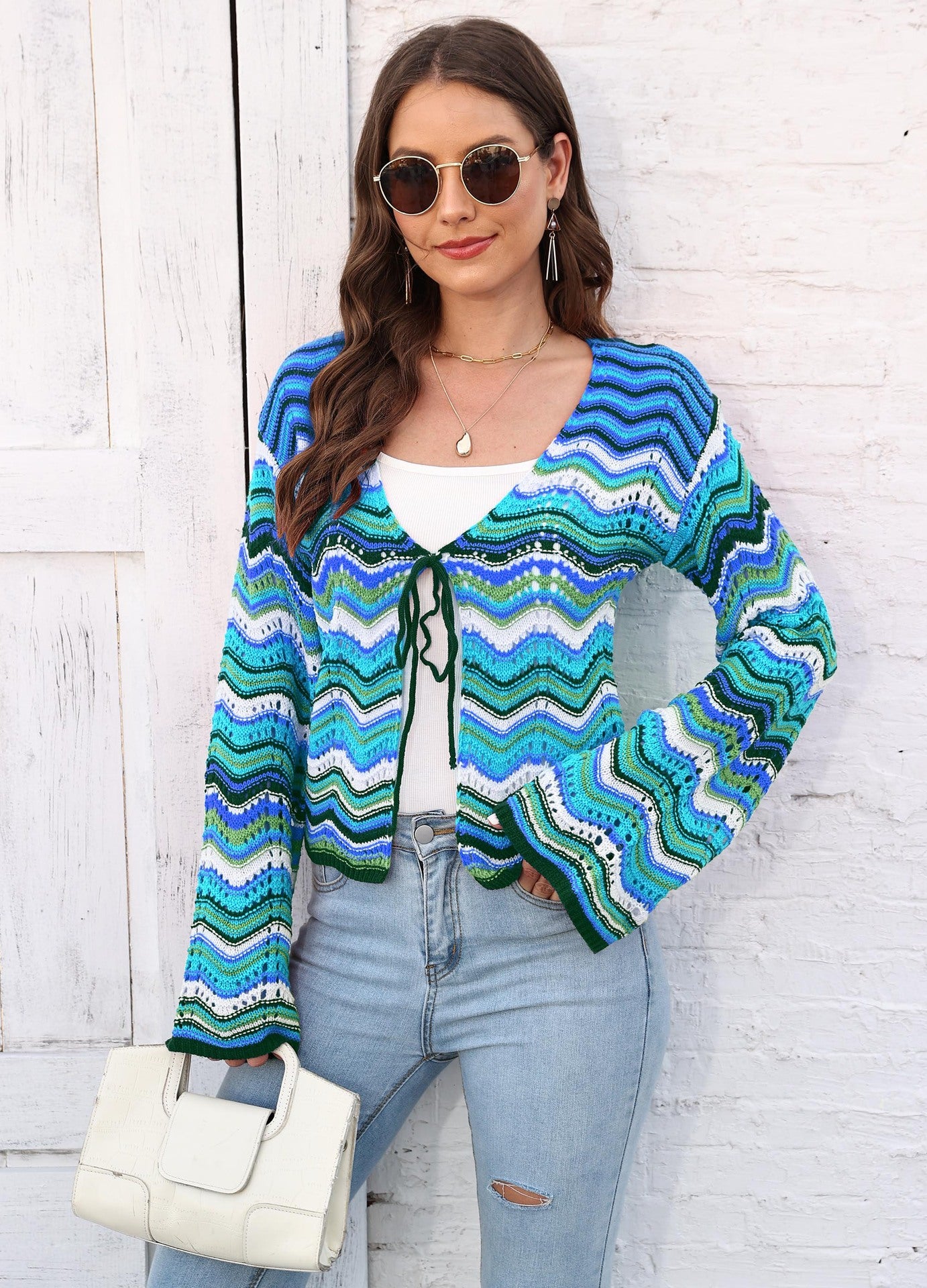 Opdag vores stilfulde damers cropped strikjakke med et unikt, farverigt bølgemønster, der giver dit outfit et friskt præg. Denne jakke kombinerer komfort og stil på ideel vis.