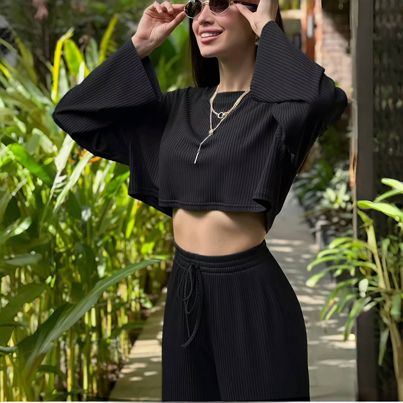 Satse på stilfuld komfort med damet cropped sweater og løse bukser sæt fra Stilla og nyd sommeren i fulde drag!