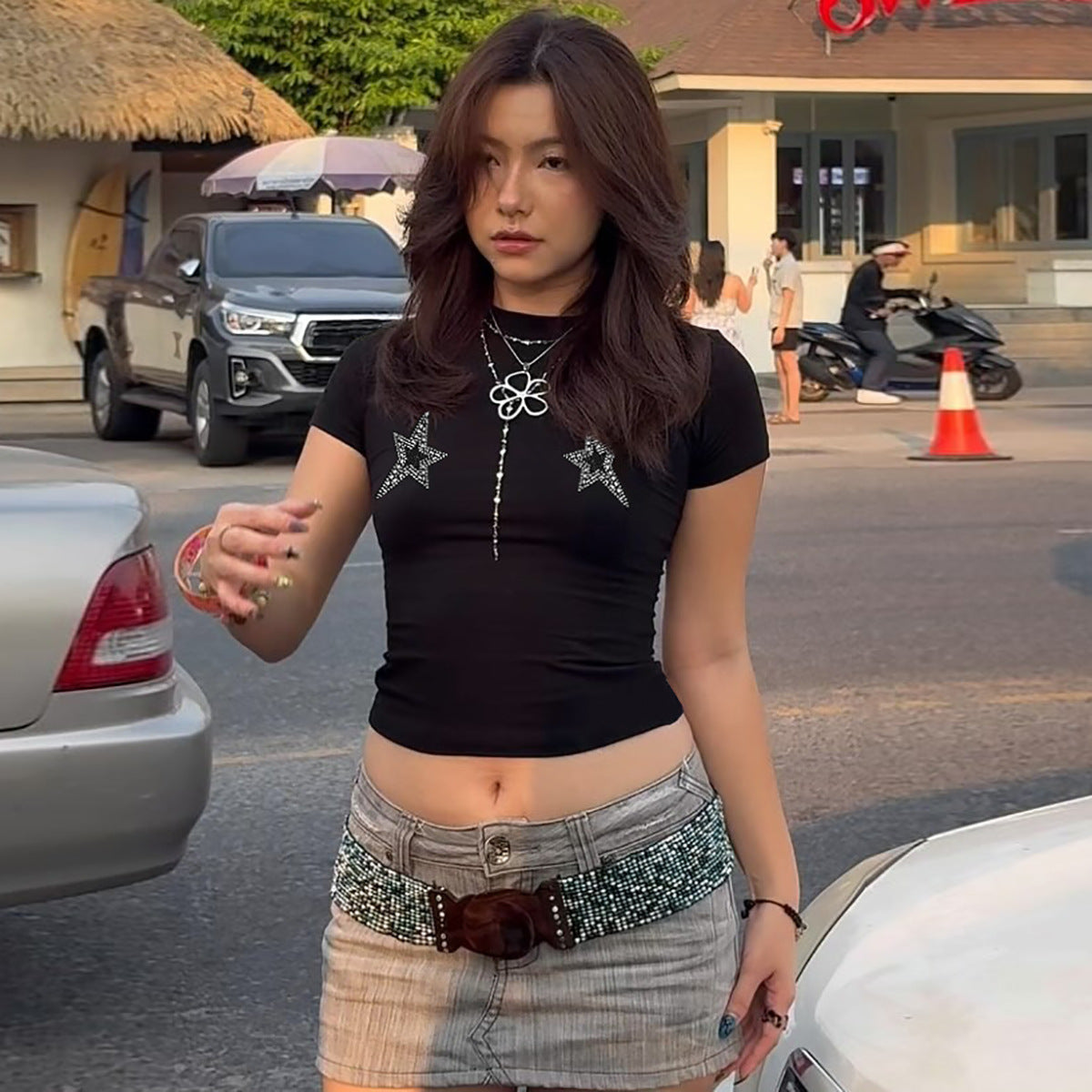Opdag vores elegante dam cropped t-shirt med funklende stjerne-applikationer, der løfter dit look til et nyt niveau. Dette fashionable top kombinerer komfort og stil og er ideelt til enhver lejlighed, fra afslappede sammenkomster til spændende nætter i byen.