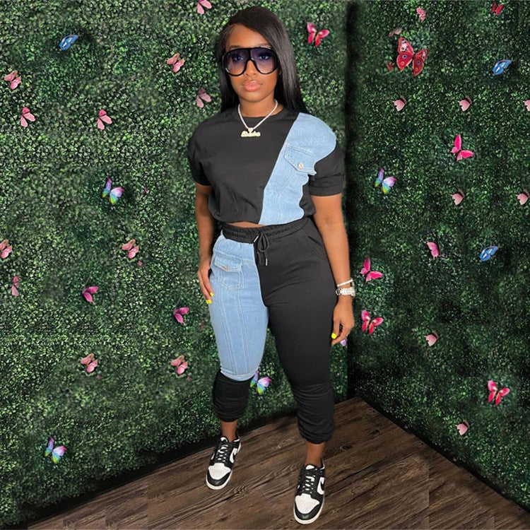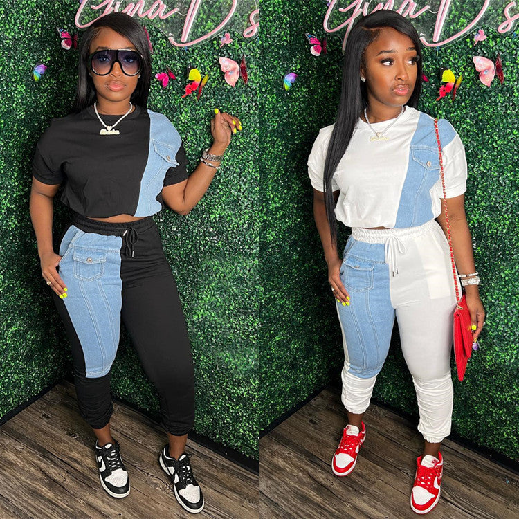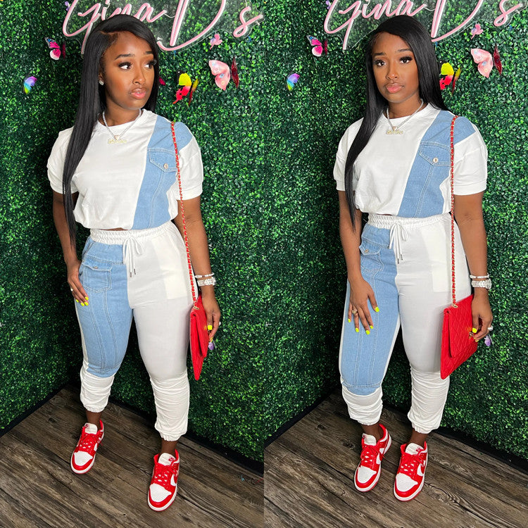 Opdag det unikke dames denim-mix joggingtøj fra Stilla, der forener stil og komfort. Dette fashionable sæt kendetegnes ved et kreativt design med en cropped top og stilfulde, farvemæssigt adskilte bukser.