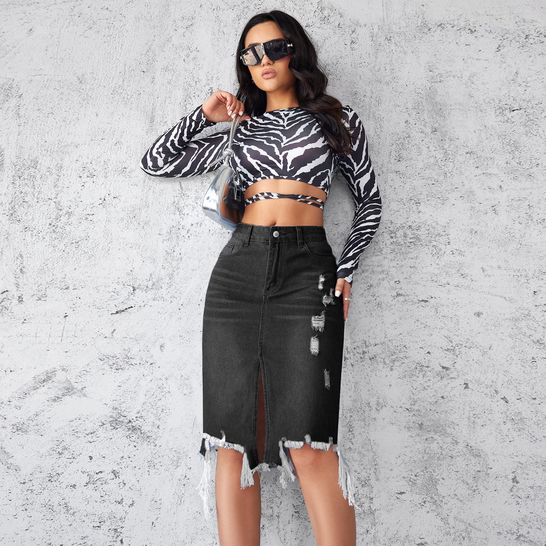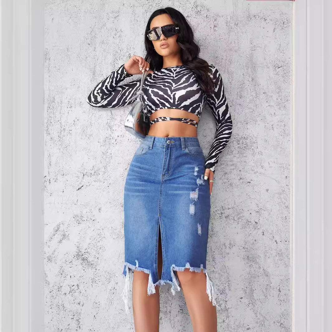 Opdag den stilfulde dames denim-nederdel, der imponerer med fransede kanter og en unik designnote. Denne nederdel forener komfort og trendbevidsthed og er det perfekte valg til forskellige anledninger.