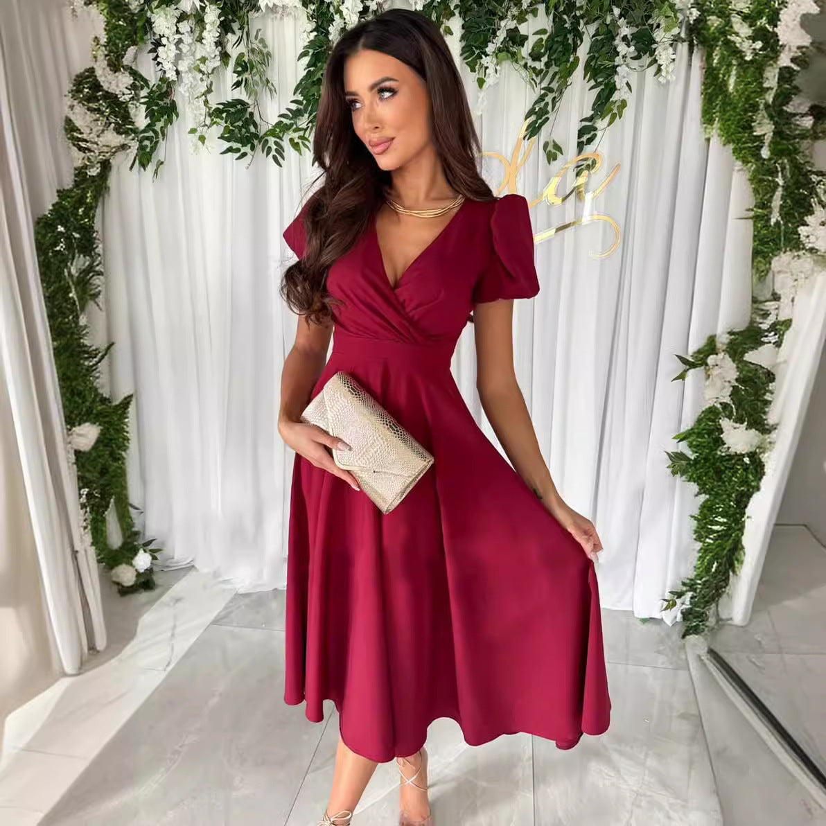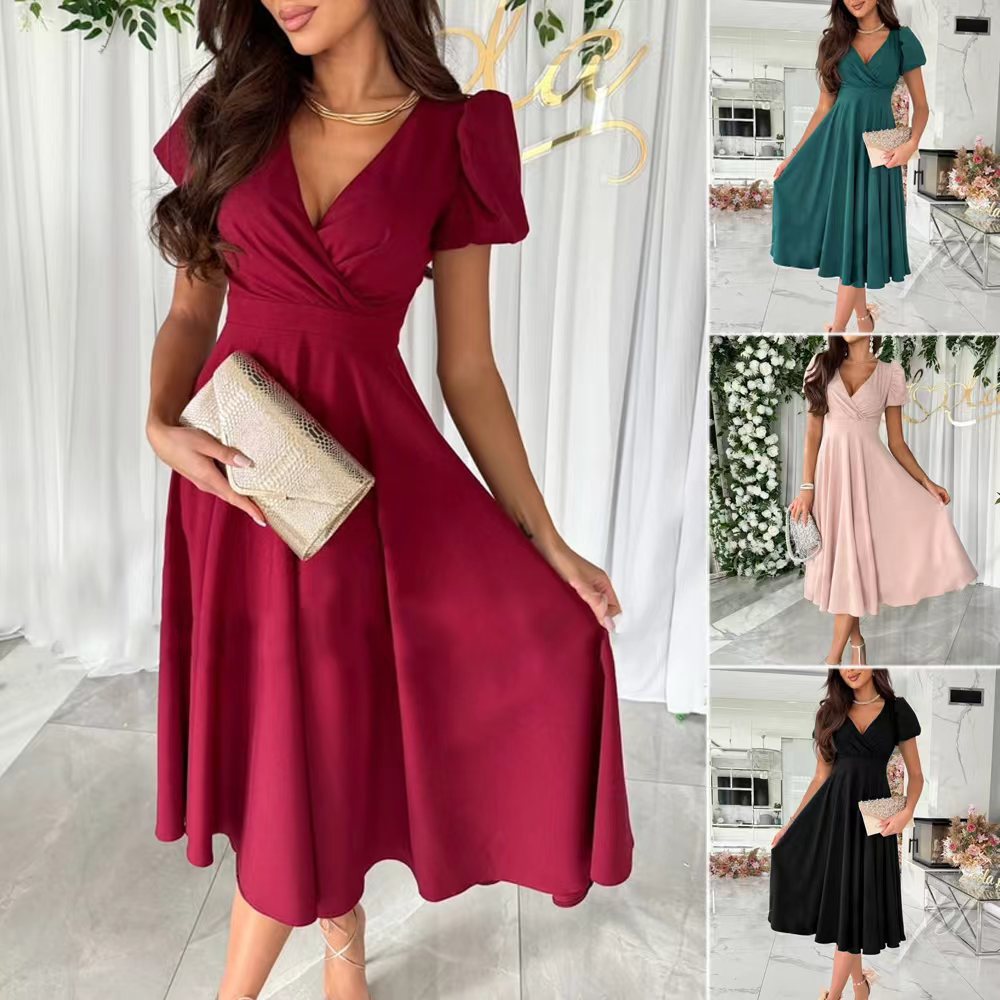 Opdag vores dames elegante A-line kjole, der begejstrer med en romantisk V-udskæring og charmerende puffærmer. Denne kjole er det perfekte valg til særlige lejligheder eller festlige begivenheder.