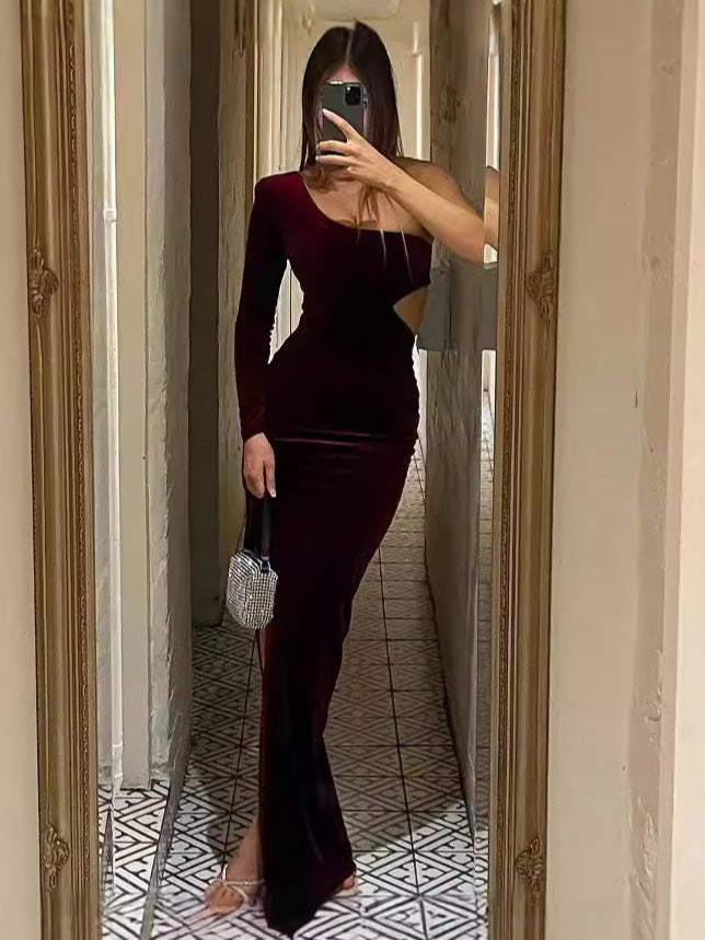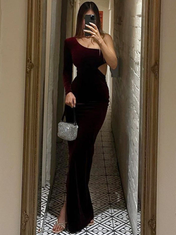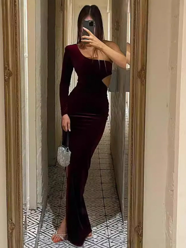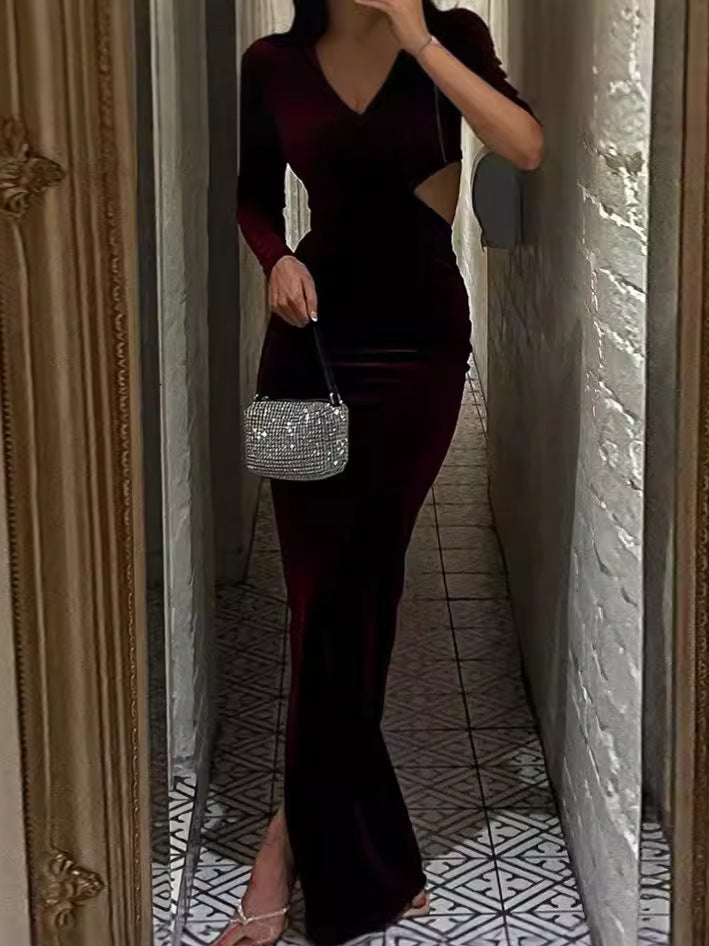 Oplev tidløs elegance med denne elegante Kjole fra Stilla, der er ideel til særlige anledninger. Designet imponerer med et asymmetrisk snit og en dyb slids, der skaber en forførende silhuet. Det højkvalitets velourmateriale giver kjolen en luksuriøs glans og sikrer høj bærekomfort.