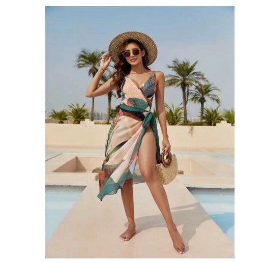 Berig din badetøjs-kollektion med dette alsidige sæt, der er perfekt til ferierejser, poolfester eller afslappede dage i solen. Femme Elegant Floral Print Swim Set med matchende indpakningsskørt fra Stilla er det perfekte valg for en ubesværet sommerstil.