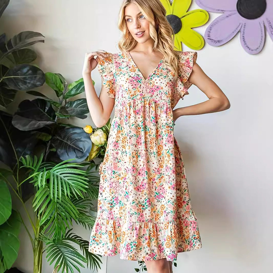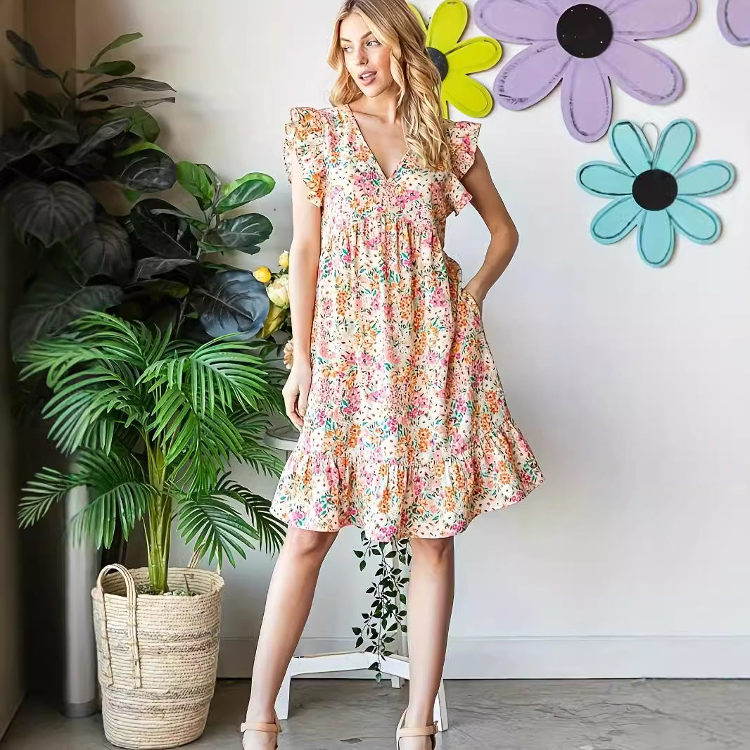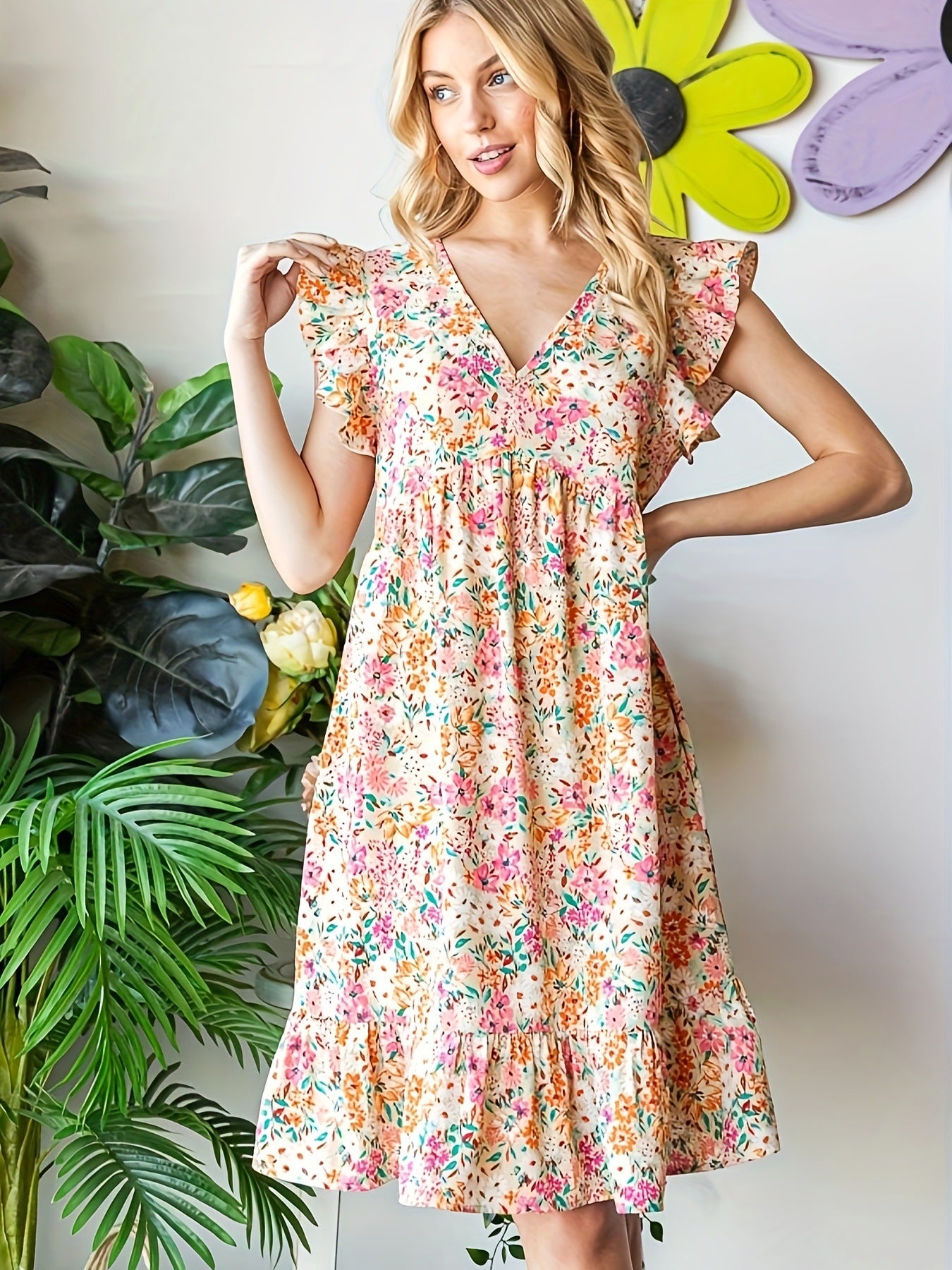 Opdag den perfekte sommerkjole med vores elegante blomsterdesign, der er ideelt til varme dage. Kjolen imponerer med en v-udskæring og stilfulde flæseudskæringer på ærmerne, som giver dig et feminint og romantisk look.