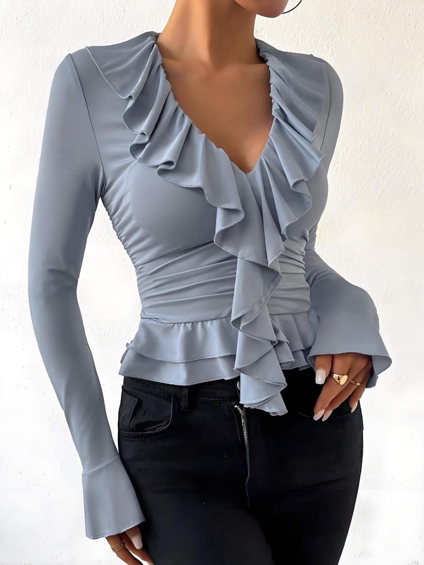Oplev den tidløse elegance af vores dametop med flydende flæsekant fra Stilla. Dette eksklusive stykke tøj kombinerer stil og komfort og gør det til det perfekte valg til enhver lejlighed.