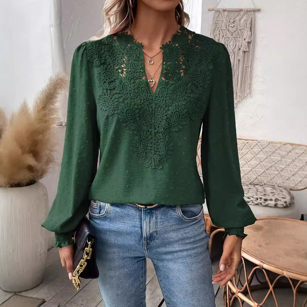 Denne damesbluse kombinerer stil og komfort på perfekt vis. Med sine kunstfærdige blonde dekorationer og det enkle, men elegante design er den det ideelle valg til forskellige lejligheder, fra formelle begivenheder til afslappede udflugter.