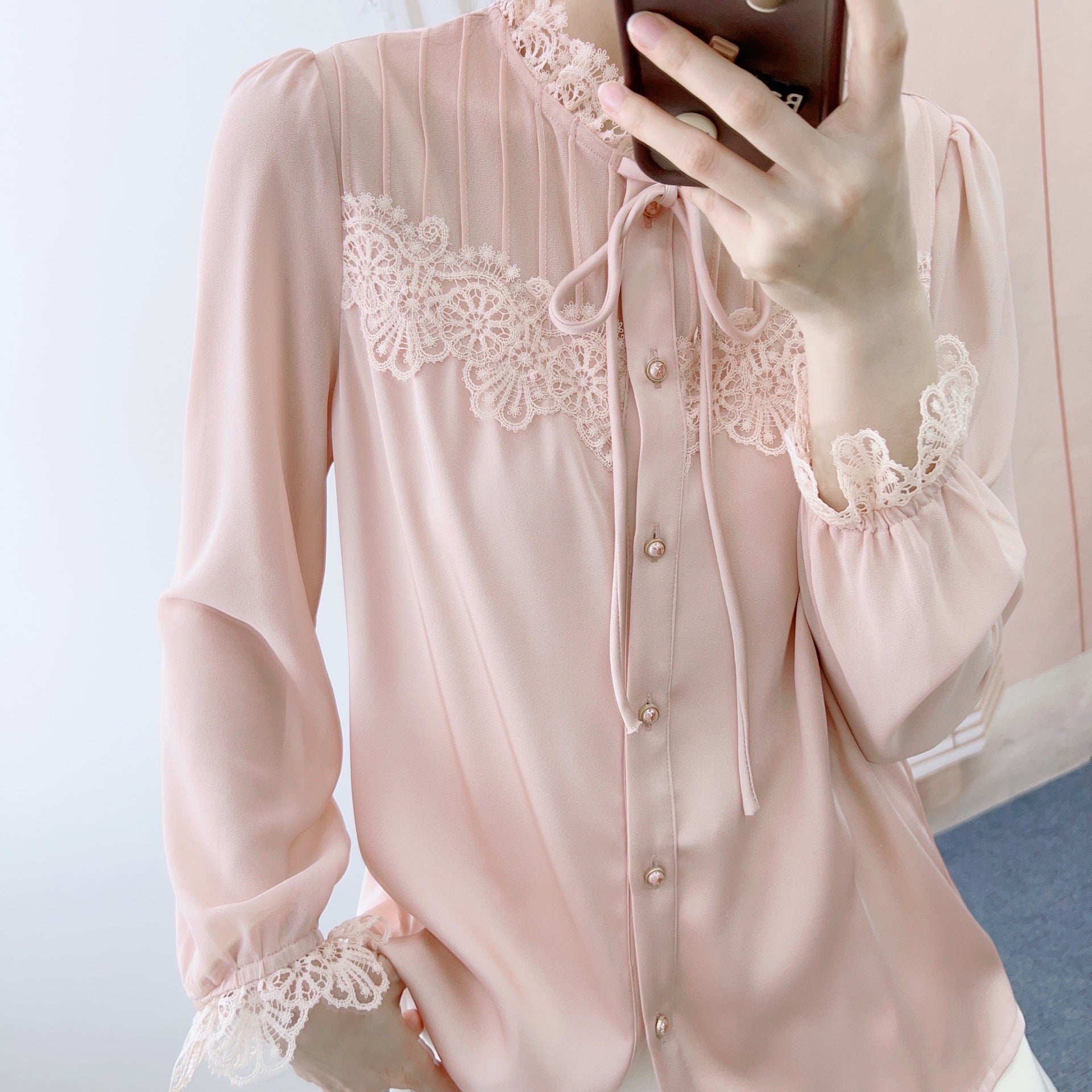 De bløde folder og den detaljeorienterede blondeudsmykning ved kraven og ærmekanterne giver denne skjorte et elegant udseende, der er velegnet til både formelle anledninger og hverdagen.