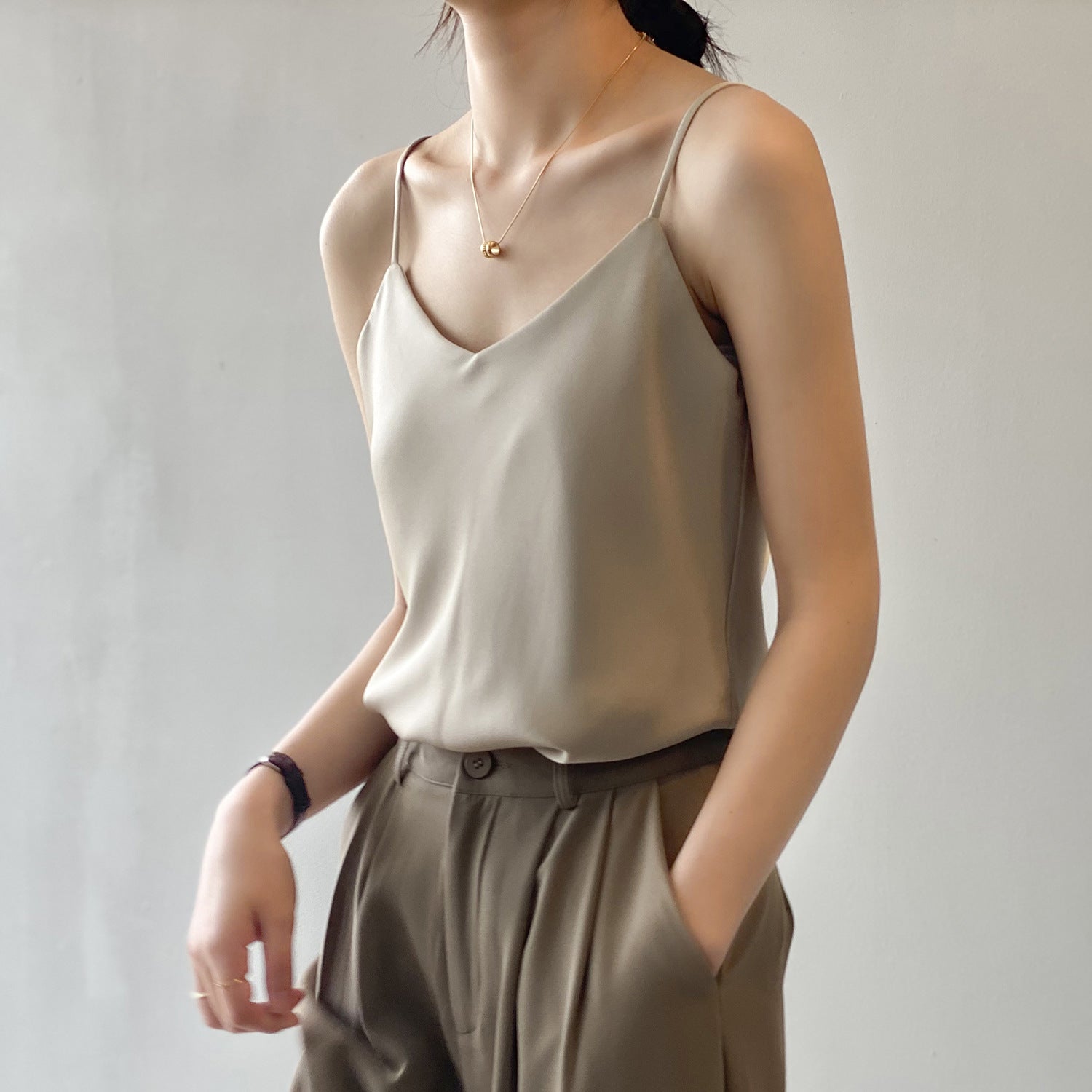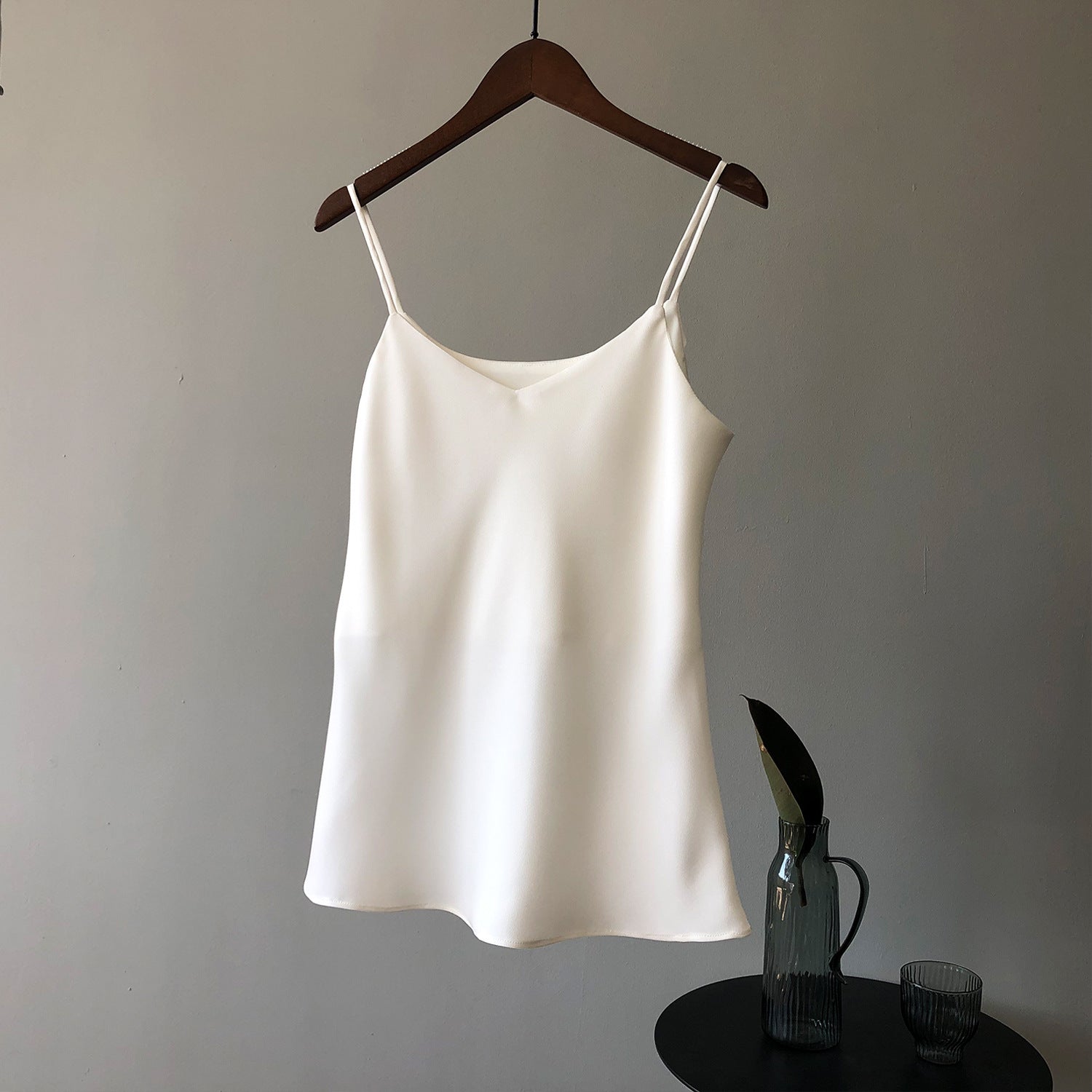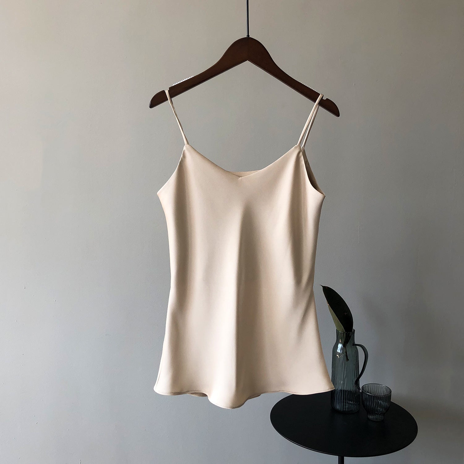 Opdag vores elegante camisole-top, der imponerer med sit fine satinvæv og de justerbare spaghetti-stropper. Denne top er ikke kun stilfuld, men også alsidigt kombinerbar. Ideel til varme sommeraftener eller som en undertrøje til dit look.