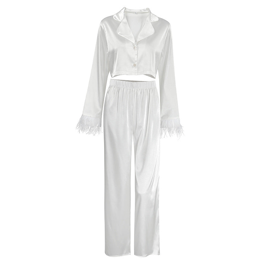 Oplev den perfekte kombination af elegance og komfort med dette stilfulde ensemble bestående af en cropped top og en bredt skåret bukser med luksuriøse fjerdetaljer. Dette outfit er ideelt til særlige lejligheder eller afslappede aftener og giver dig et strejf af glamour.
