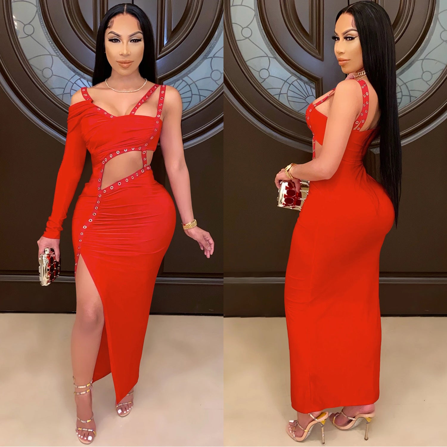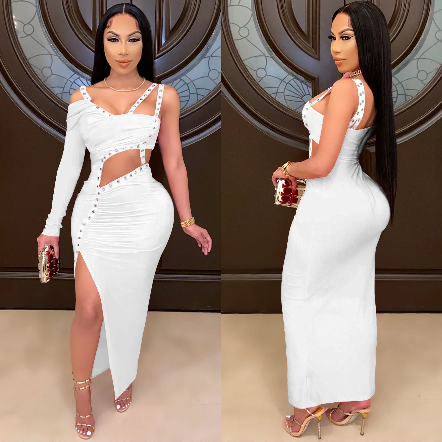 Oplev vores Dame Elegant Cut-Out Maxi-kjole med asymmetrisk design og funktionelle knapdetaljer. Denne fantastiske kjole forener stil og komfort, ideel til særlige lejligheder eller elegante aftenarrangementer.