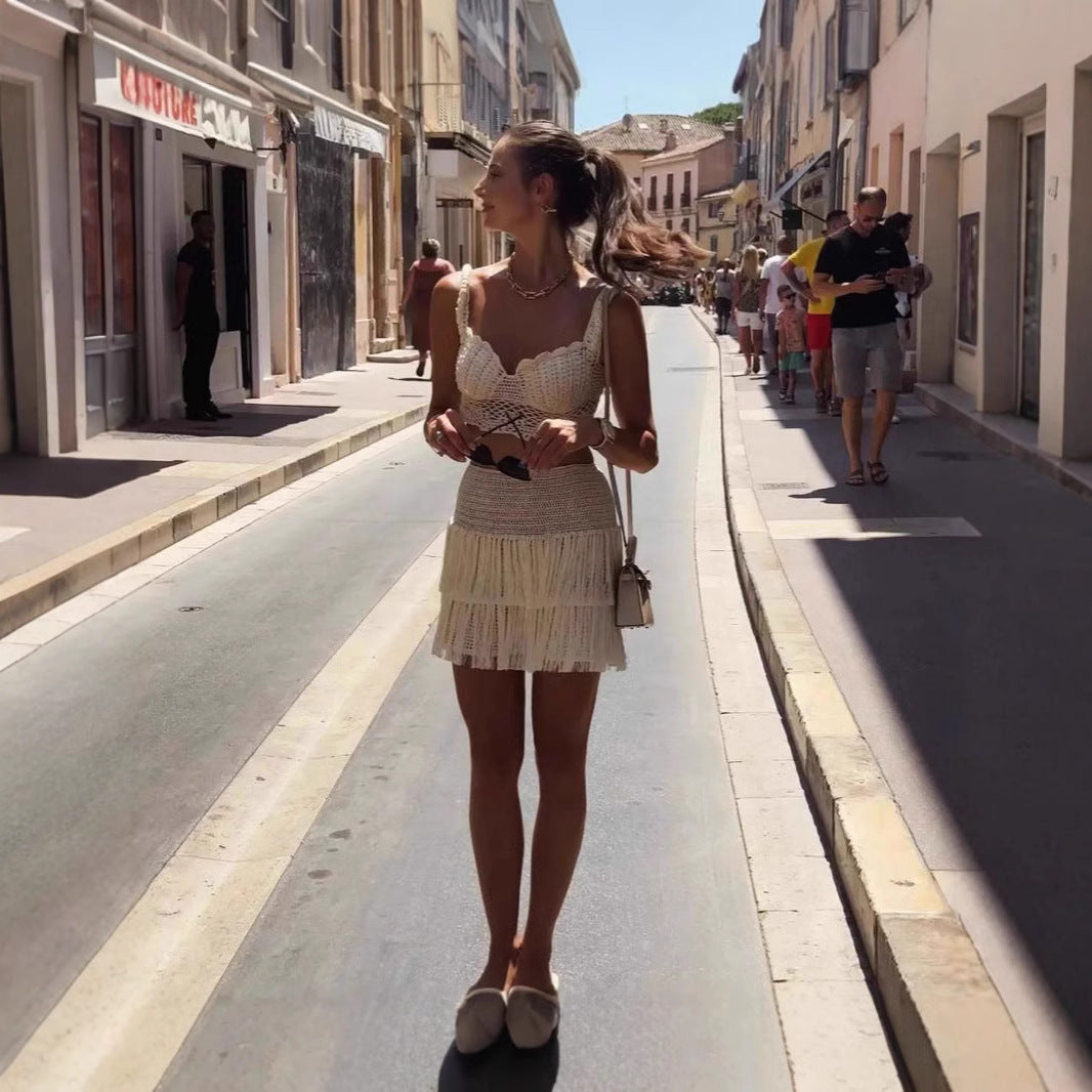 Opdag vores stilfulde og iøjnefaldende hæklede top med frynser, perfekt til varme sommerdage. Dette sæt tilbyder et elegant look, der både er smart og komfortabelt.