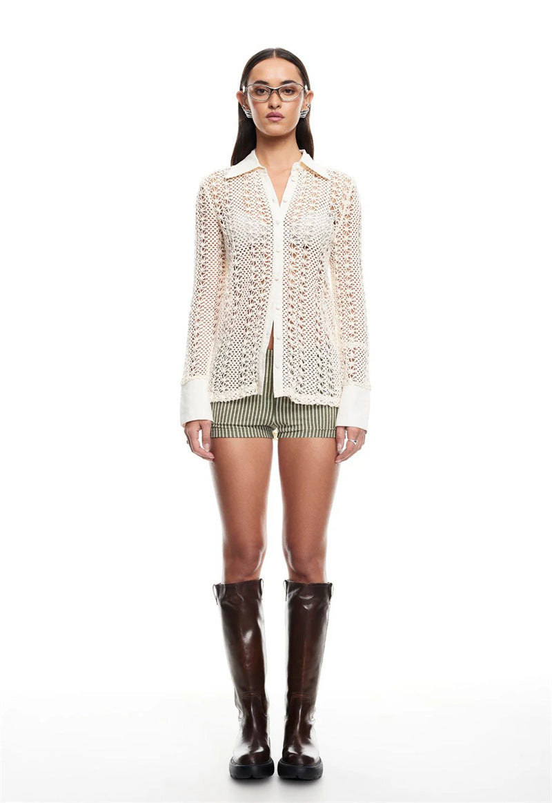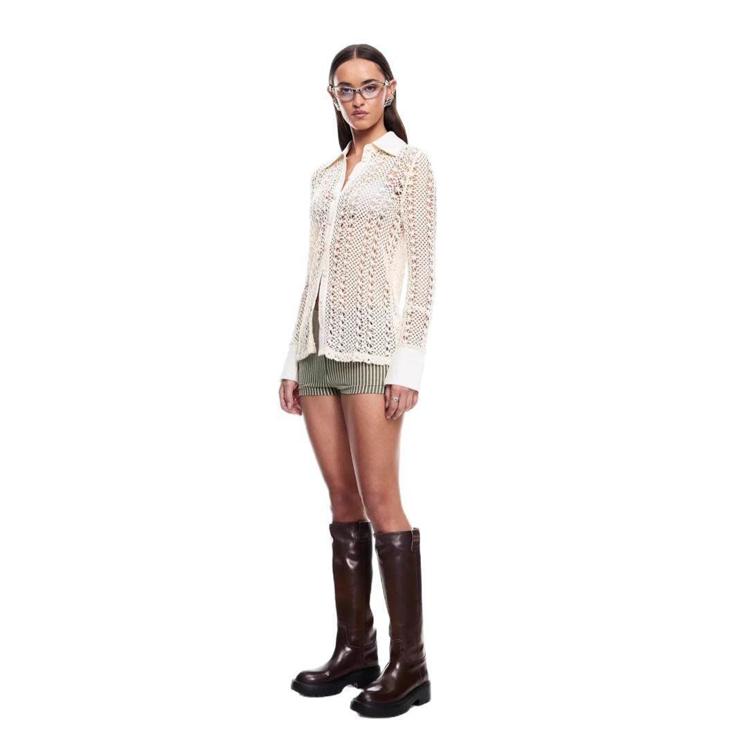 Oplev Stilla' elegante damehæklebluse med klassisk krave og gennemsigtigt design – et must-have til enhver moderne garderobe. Blusen udmærker sig ved sin unikke hækle-teknik, som giver et legende og samtidig elegant udseende.