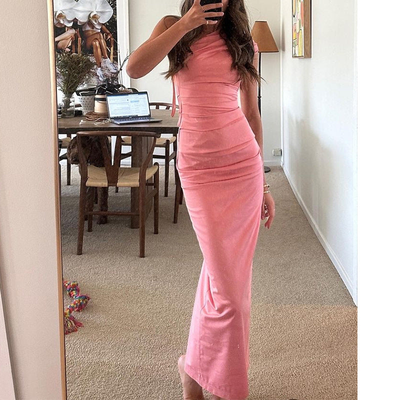 Oplev vores dames elegante etuikjole, der imponerer med sit raffinerede asymmetriske overdel og figursyede snit. Denne kjole er det perfekte valg til bryllupper, aftenevents eller særlige fejring.