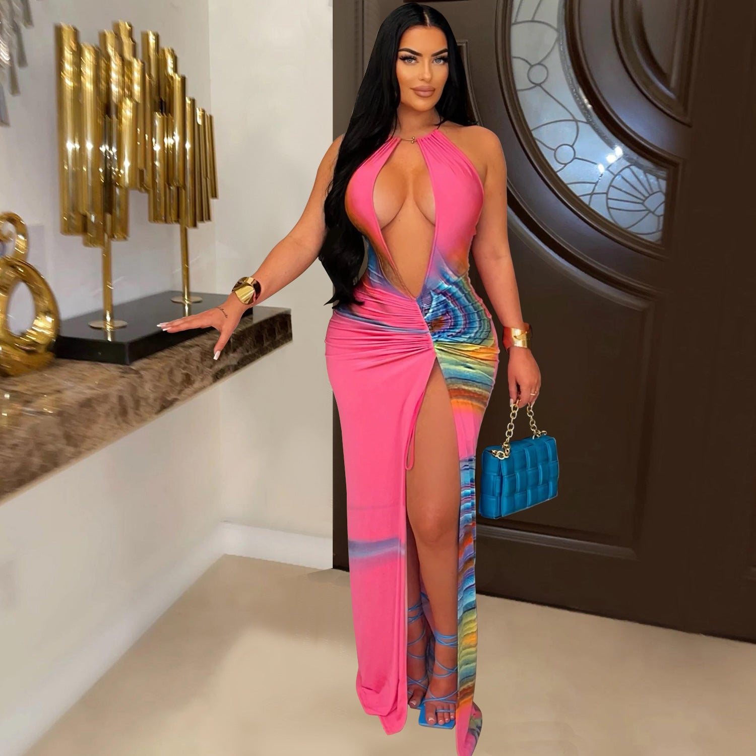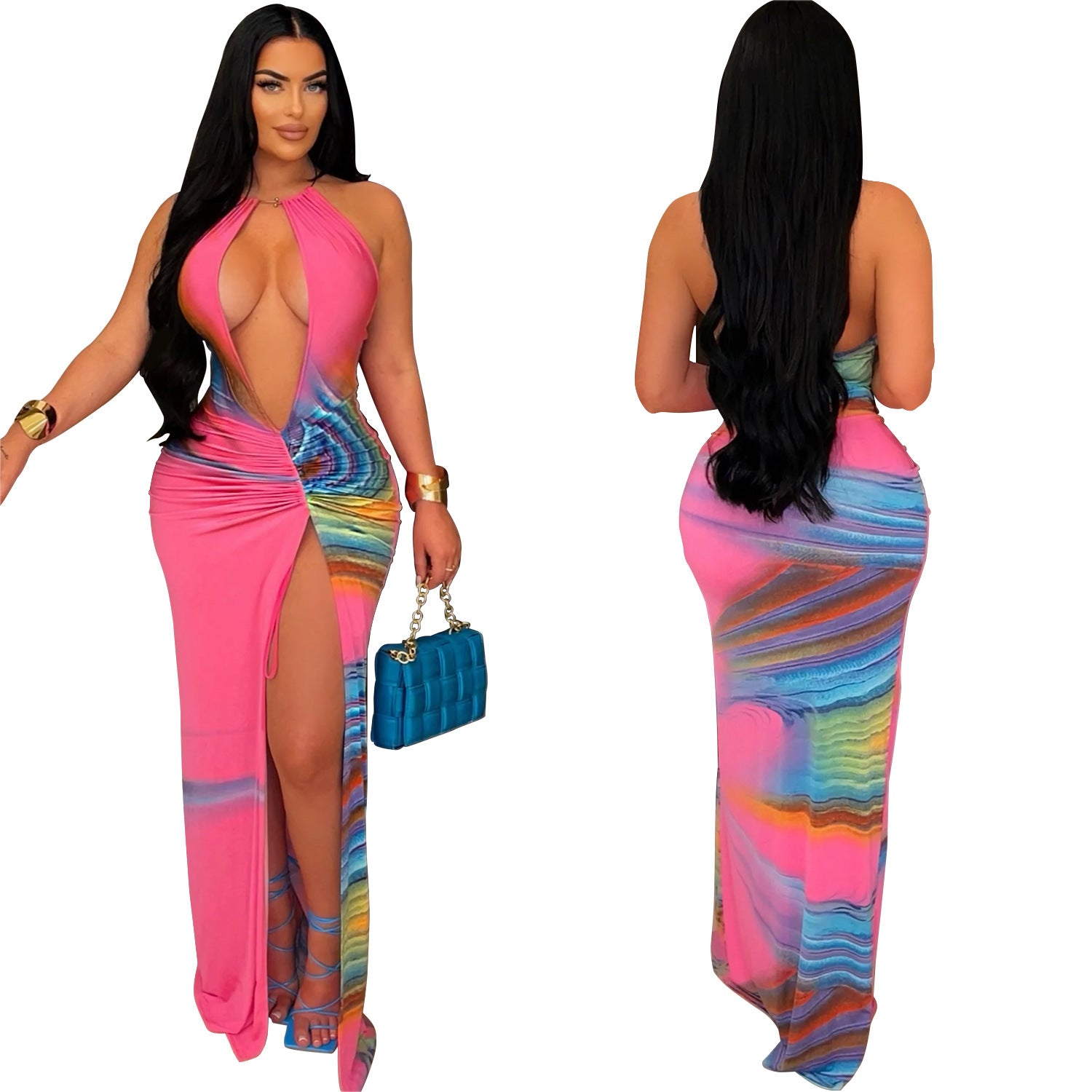 Dette fantastiske maxikjole kombinerer stilfuldt design med moderne chic. Perfekt til særlige anledninger eller elegante aftenarrangementer, fremhæver det din silhuet med en markeret V-udskæring og en legende cut-out detalje.