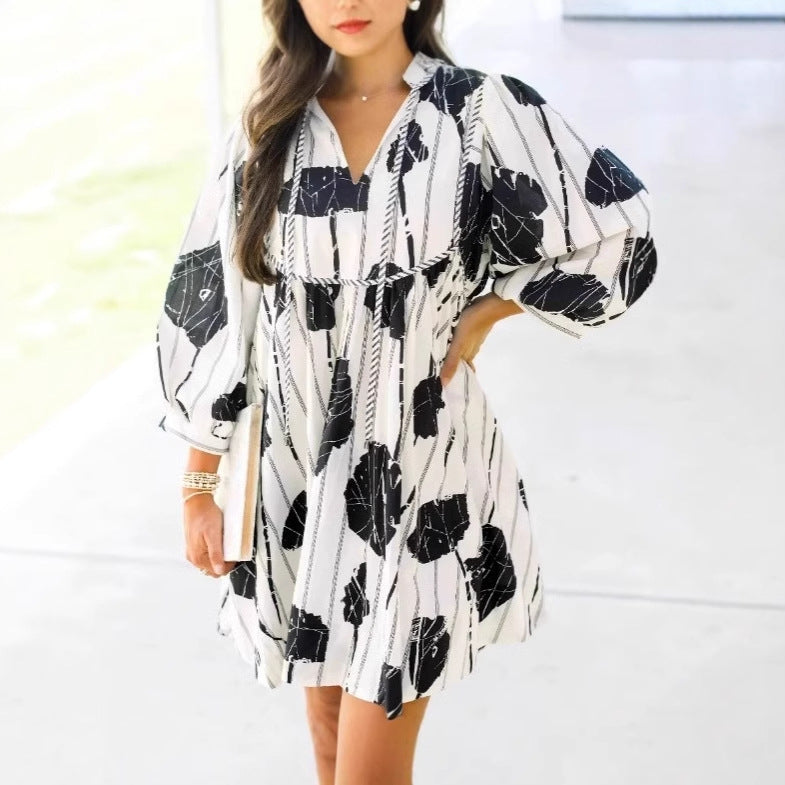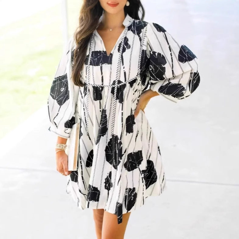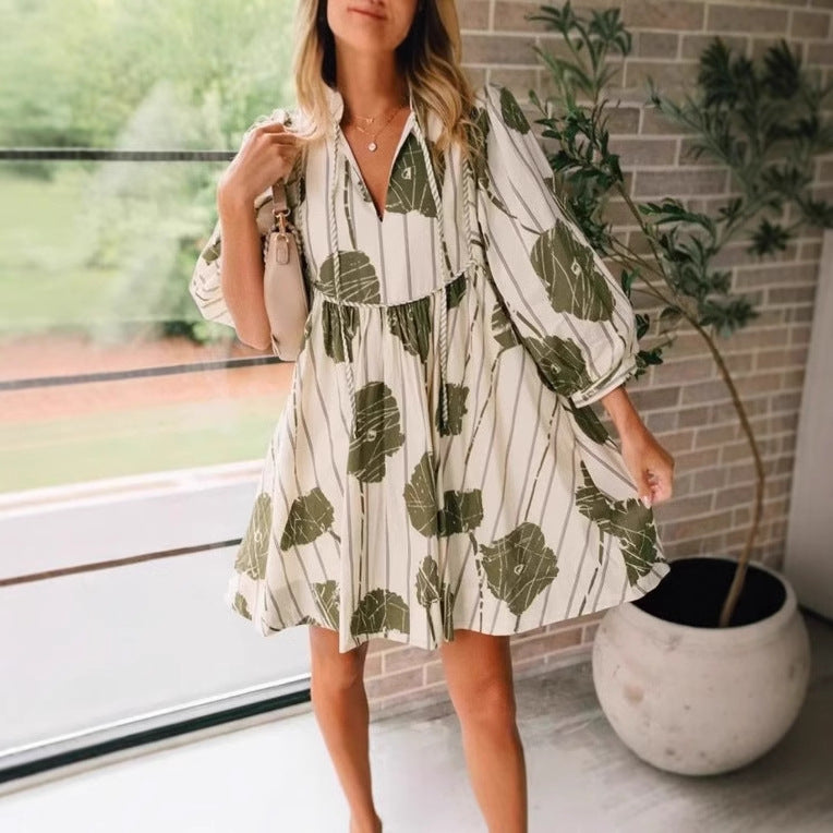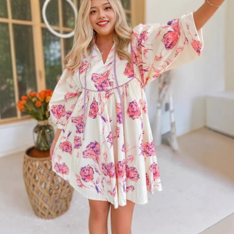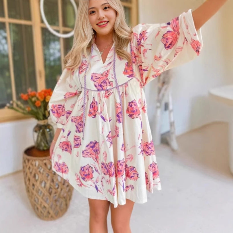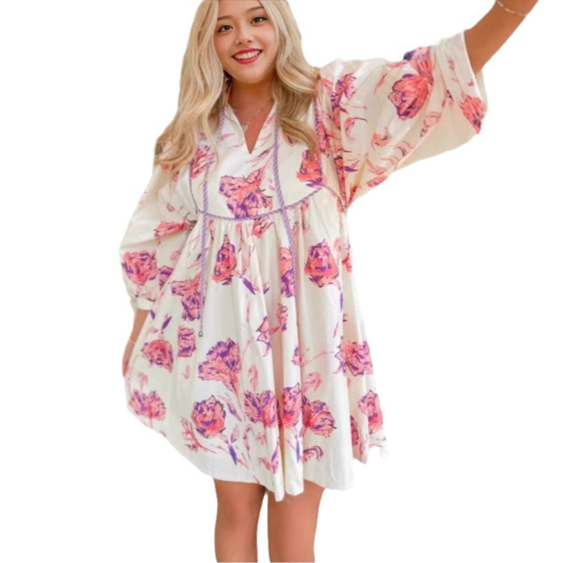 Opdag vores damers afslappede blusekjole med blomsterdesign og udstället snit. Denne vidunderlige kjole kombinerer elegance og komfort og er perfekt til varme sommerdage eller særlige anledninger.