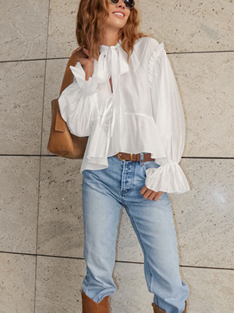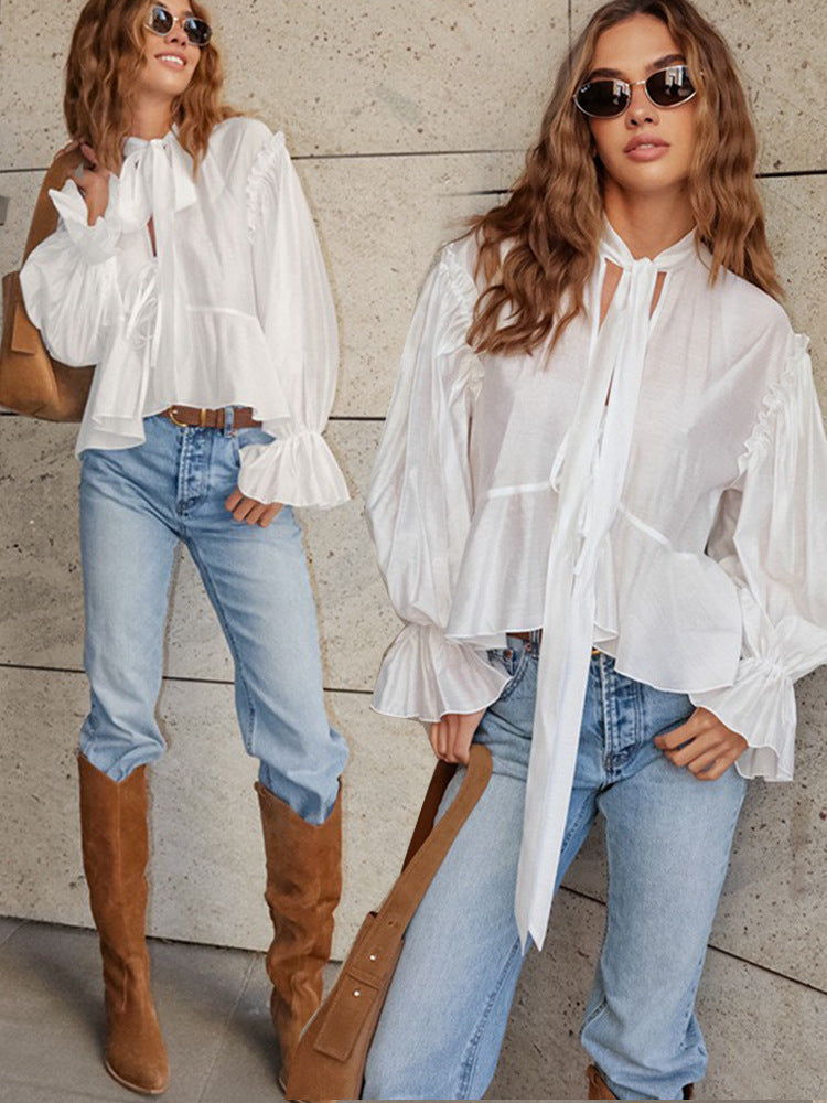 De volangdetaljer på ærmerne og i nederkant giver et romantisk præg, mens den løse pasform sikrer optimal bevægelsesfrihed. Denne bluse er perfekt til forskellige anledninger - hvad enten det er på kontoret, til venindemøde eller til middag.
