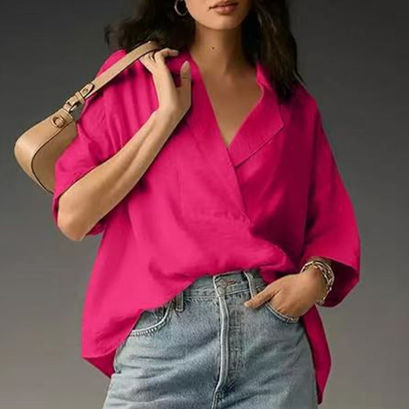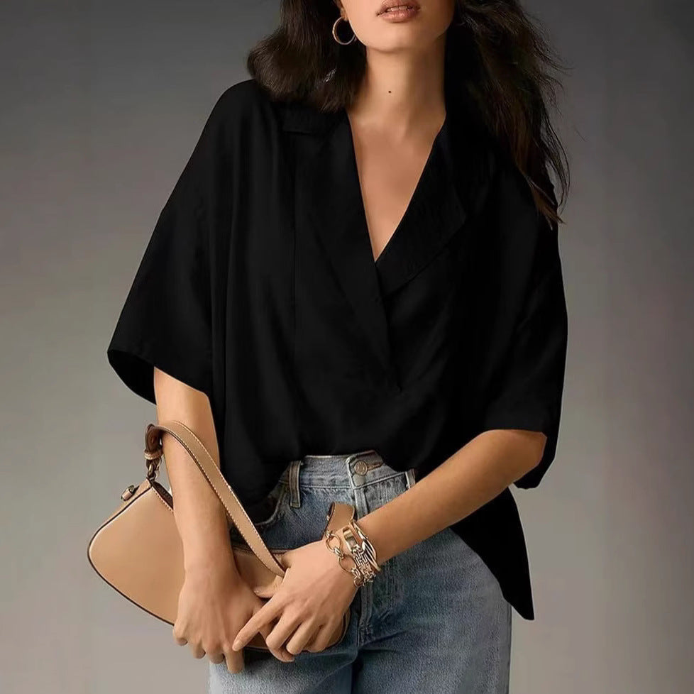 Opdag den ultimative kombination af stil og komfort med vores dame casual bluse. Denne bluse tilbyder ikke kun en moderne V-udskæring, men også en generøs, flydende snit, der smigrer silhuetten.