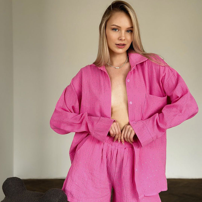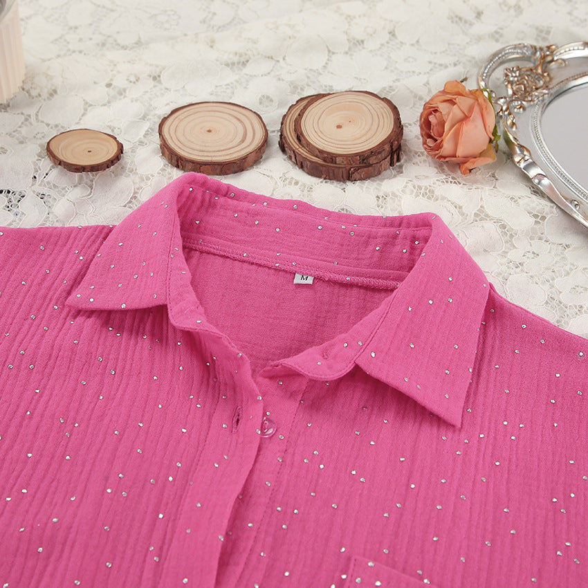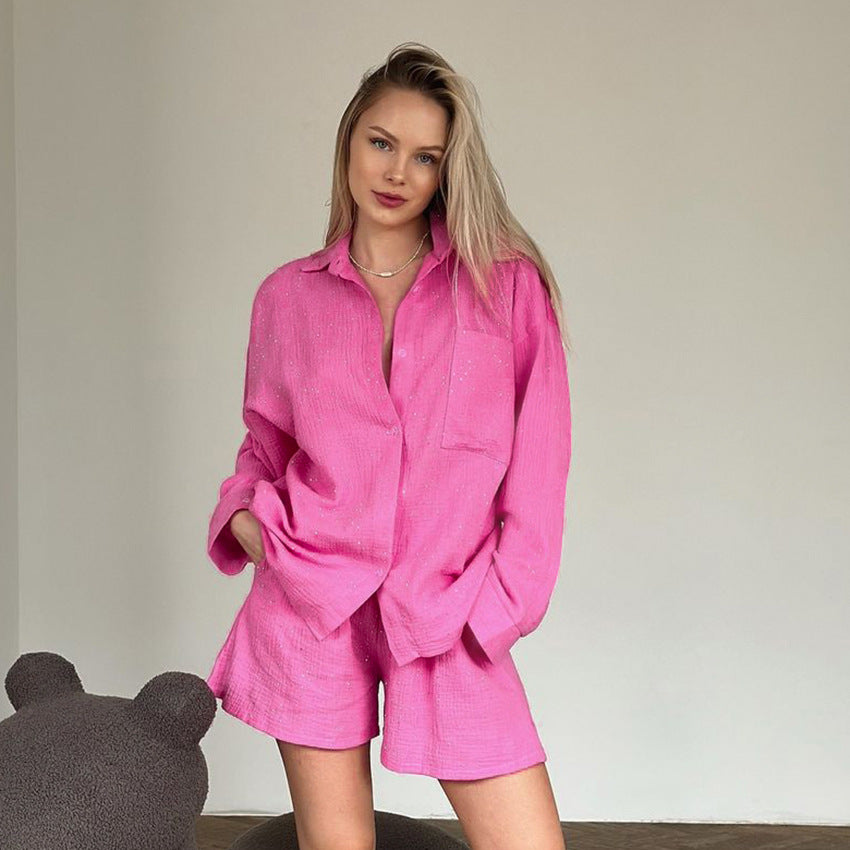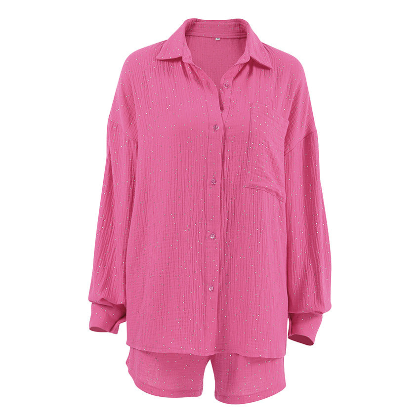 Dette dameslætte oversized skjorte- og shorts-sæt fra Stilla er den perfekte kombination af komfort og stil. Fremstillet af let, åndbart materiale, er det ideelt til varme sommerdage eller afslappede aftener derhjemme.