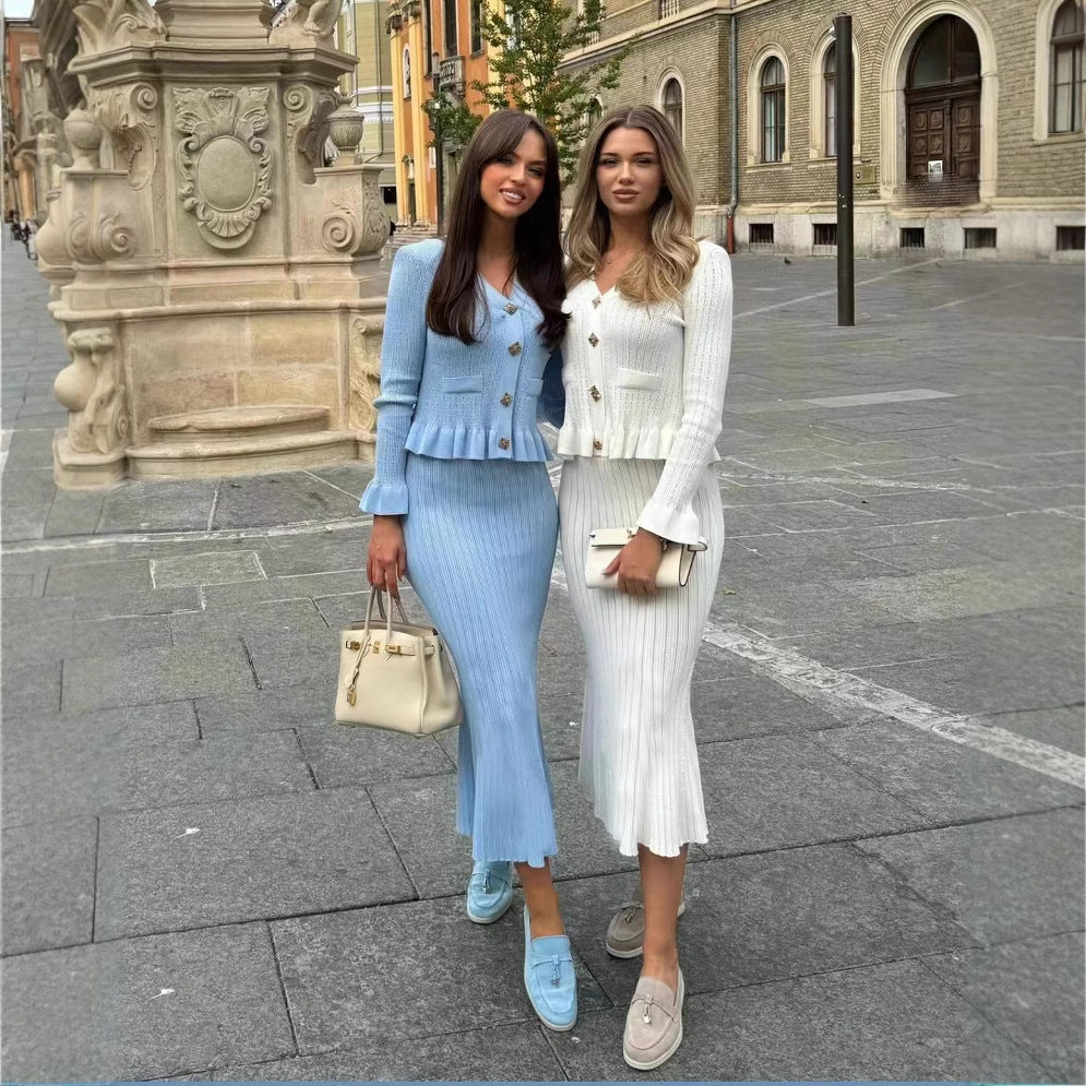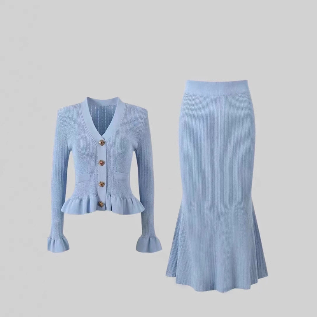 Dame strikjakker og nederdel sæt med feminine flæser Stilla