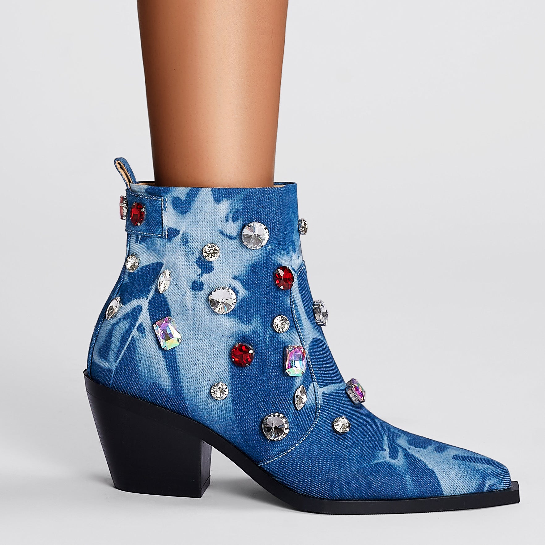 Glid ind i stil med de udsmykkede denim-ankelstøvler med krystalaccents fra Stilla. Disse unikke støvler kombinerer modeelementer med komfortabel pasform til enhver lejlighed.
