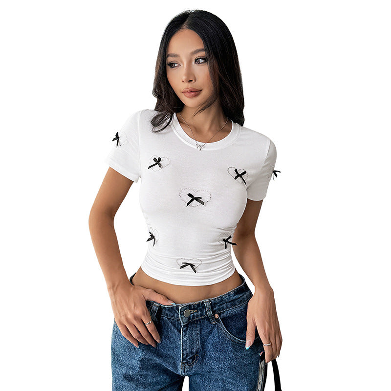 Træd ind i rampelyset med vores stilfulde, udsmykkede Crop Top med hjerte detaljer fra Stilla. Dette fashionable og moderne top har unikke hjerte designs, der er accentueret med delikate sorte sløjfer, og er et perfekt supplement til dit trendy garderobe.