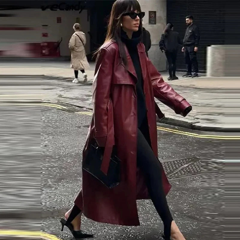 Opgrader din udendørs garderobe med vores fantastiske Femme dobbeltradet frakke i kunstlæder med bælte. Denne frakke kombinerer moderne raffinement med en tidløs silhuet og er et must-have for enhver modebevidst individuel stil.