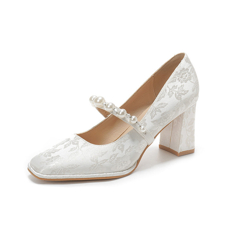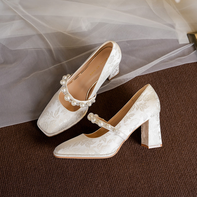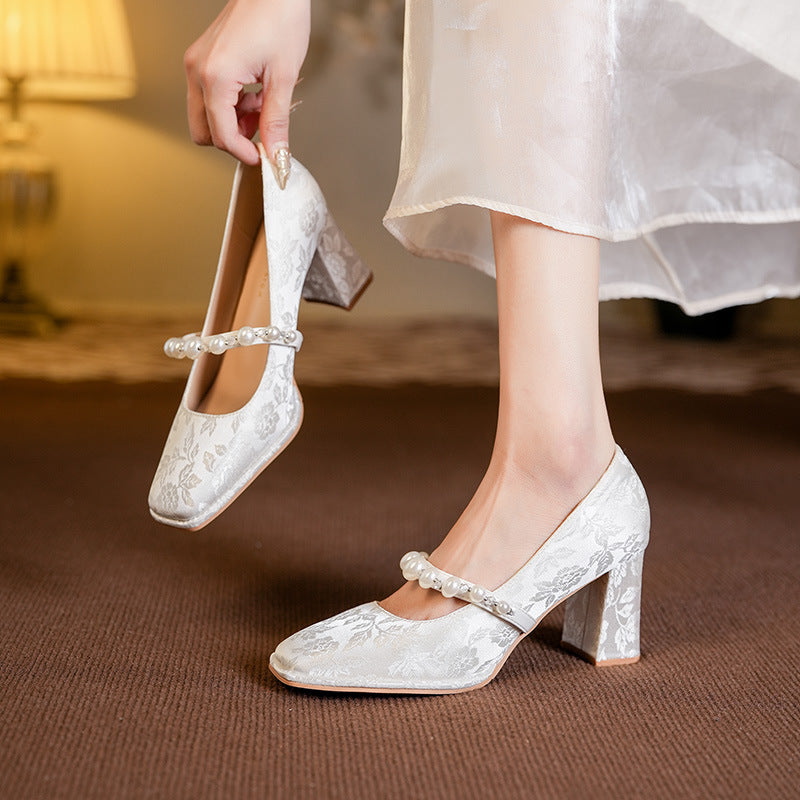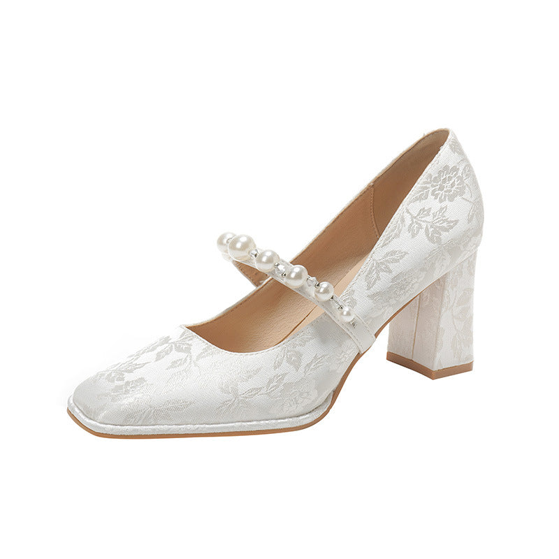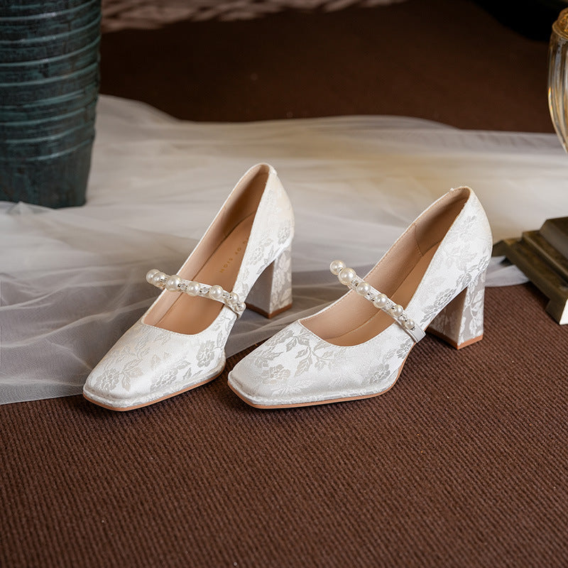 Træd ind i elegance med disse Femme Elegant Blokhælet Mary Jane Pumps, der har et fantastisk dekorativt perlerem, der giver ethvert outfit et strejf af raffinement.