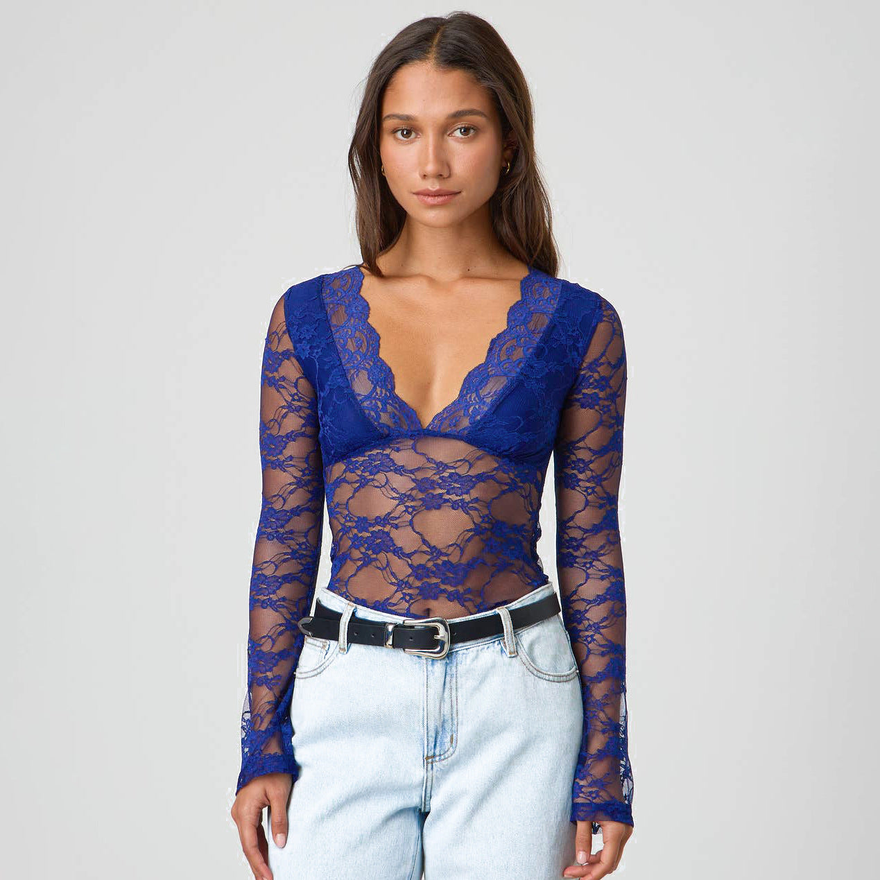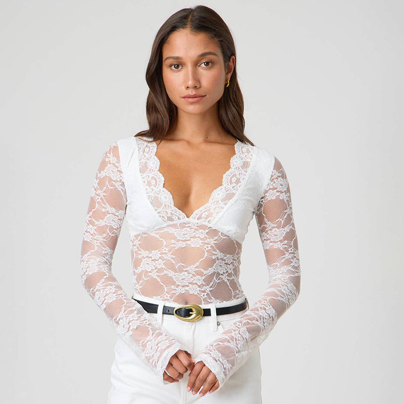 Uanset om du skal ud i byen for en aften eller vil efterlade et indtryk ved en særlig begivenhed, er den gennemsigtige blonde bodysuit med lange ærmer dit første valg for en tidløs stil.