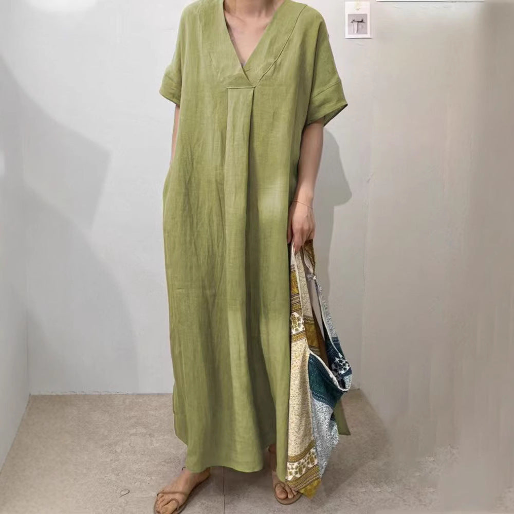 Omfavn uanstrengt elegance med vores Femme Løs Pasform V-Udsnit Maxi Kjole, et tidløst stykke der forener komfort og stil.